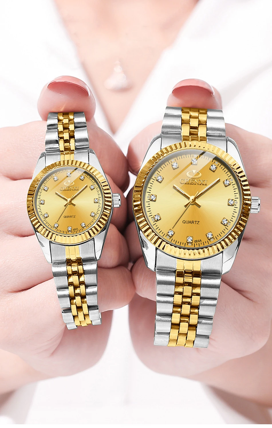 New Couple Design Stainless Steel Band Date Calendar Wristwatch Gold Quartz Watches For Women Men