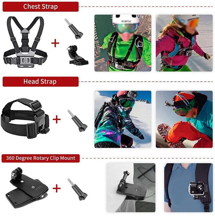 - The accessories kit is widely used in your life. It helps you take photoes and videos more easily while skiing, skating, running, cycling, boating, diving, ice hockey, surfing, etc.