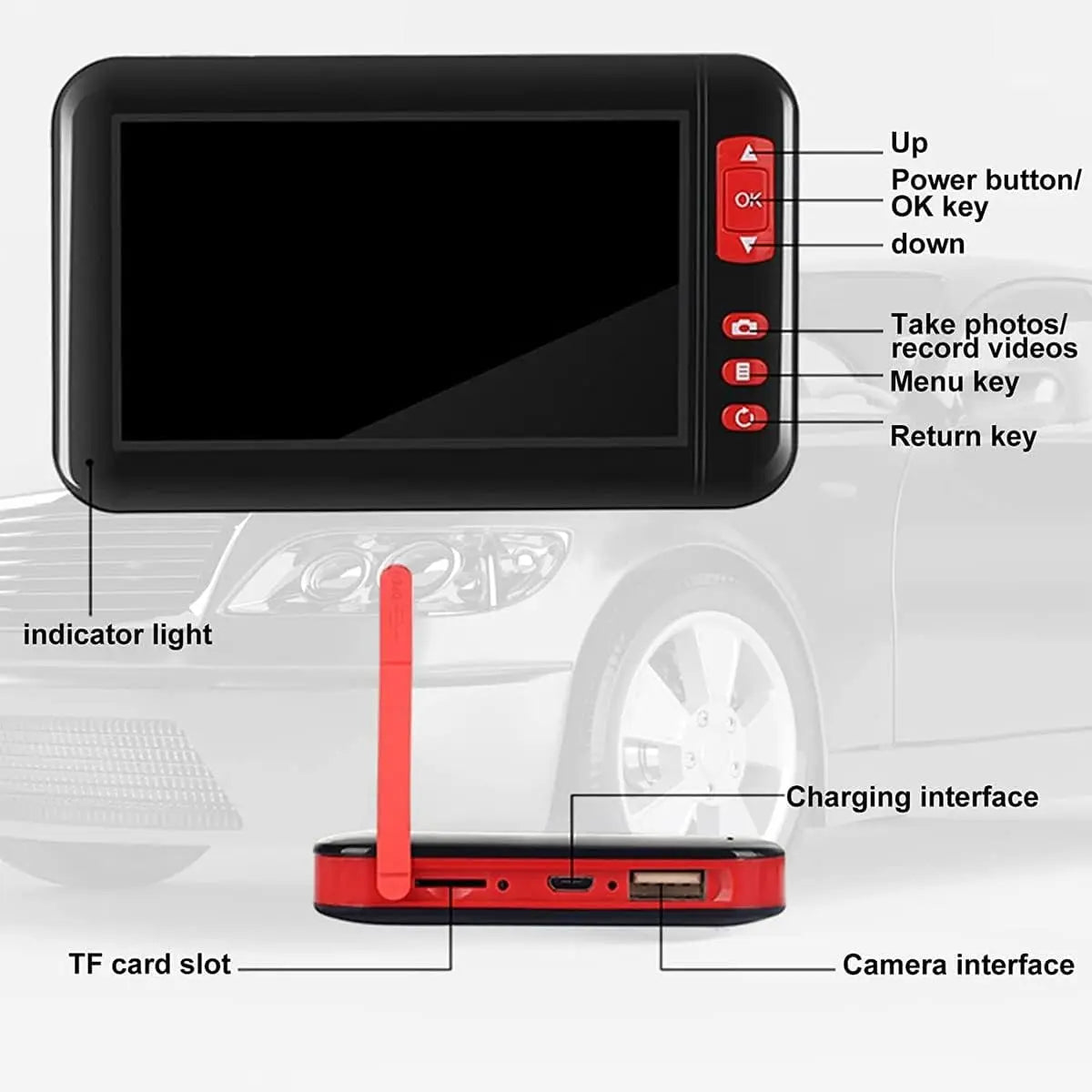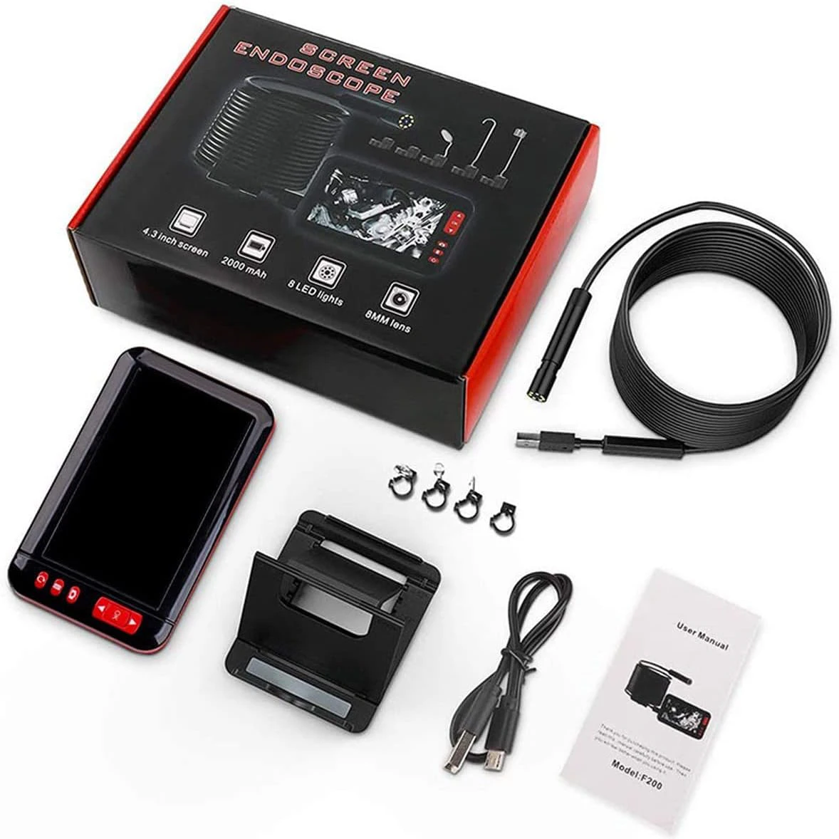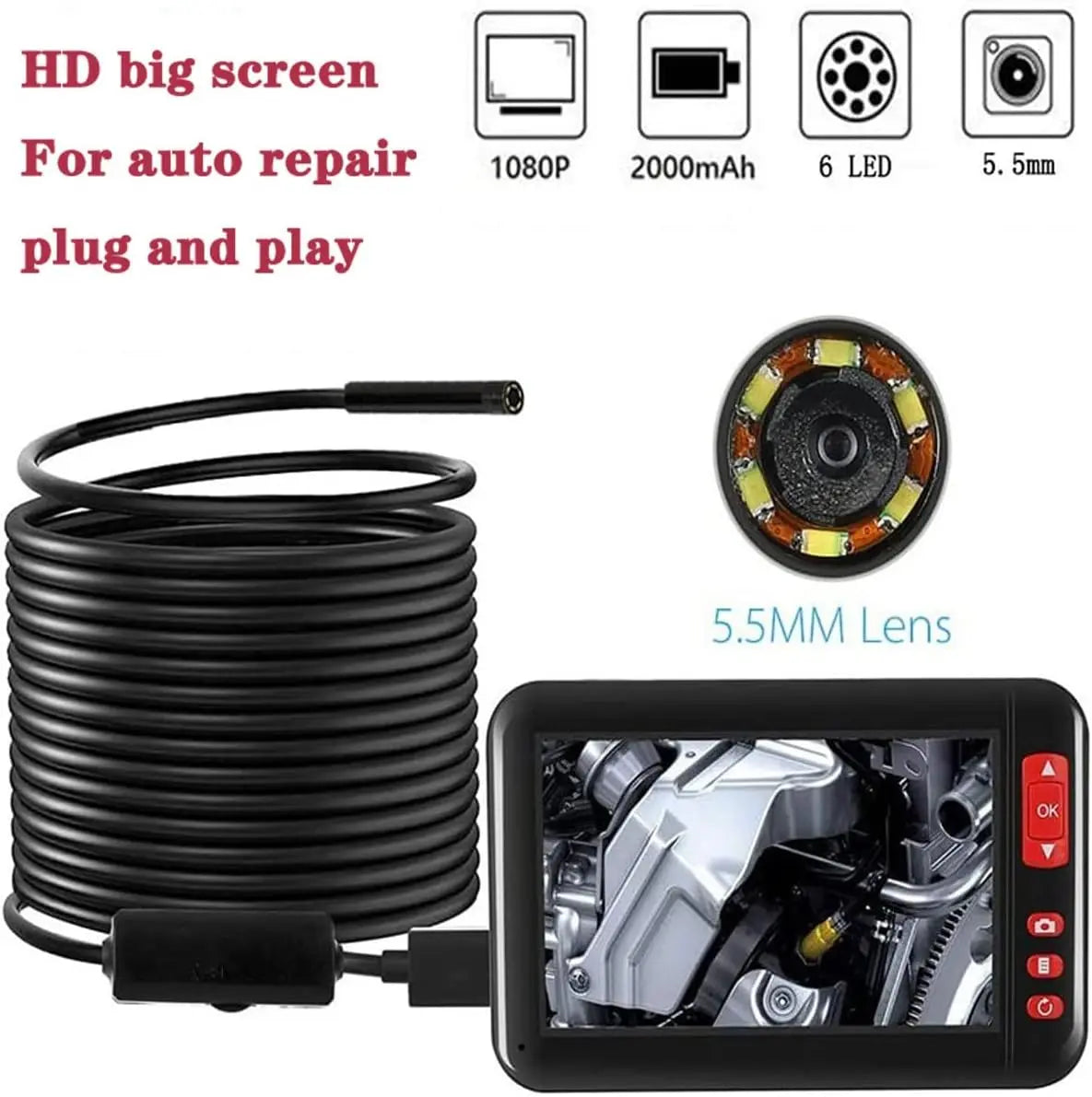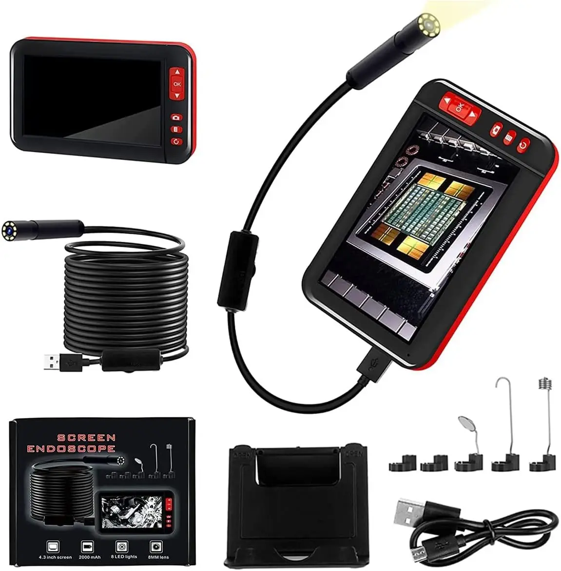 【4.3 inch LCD HD Screen】The inspection camera adopts a 4.3-inch full-color LCD screen with bright colors and clear images. It also has the functions of real-time video viewing, recording and taking pictures 【1080P Inspection Camera】The 5.5mm IP67 waterproof camera is able to capture clear images with true colors and direct and accurate. LED lights with brightness adjustment, you can see clearly even in the dark environment. 【2000mAh Large Capacity Battery】The product has a built-in 2000mAh battery. When the battery is running low, charge it with the built-in USB cable. Use a 5V 1A plug to fully charge in 3 hours, and the battery can work continuously for 3 hours after being fully charged. 【Widely Applicable】Endoscope camera with semi-rigid cable, the cable is hard enough to maintain the desired shape or angle, suitable for cleaning pipes/water pipes, inspecting boilers, steam turbines, diesel engines, confirming product wiring status, checking machine working conditions, etc.
