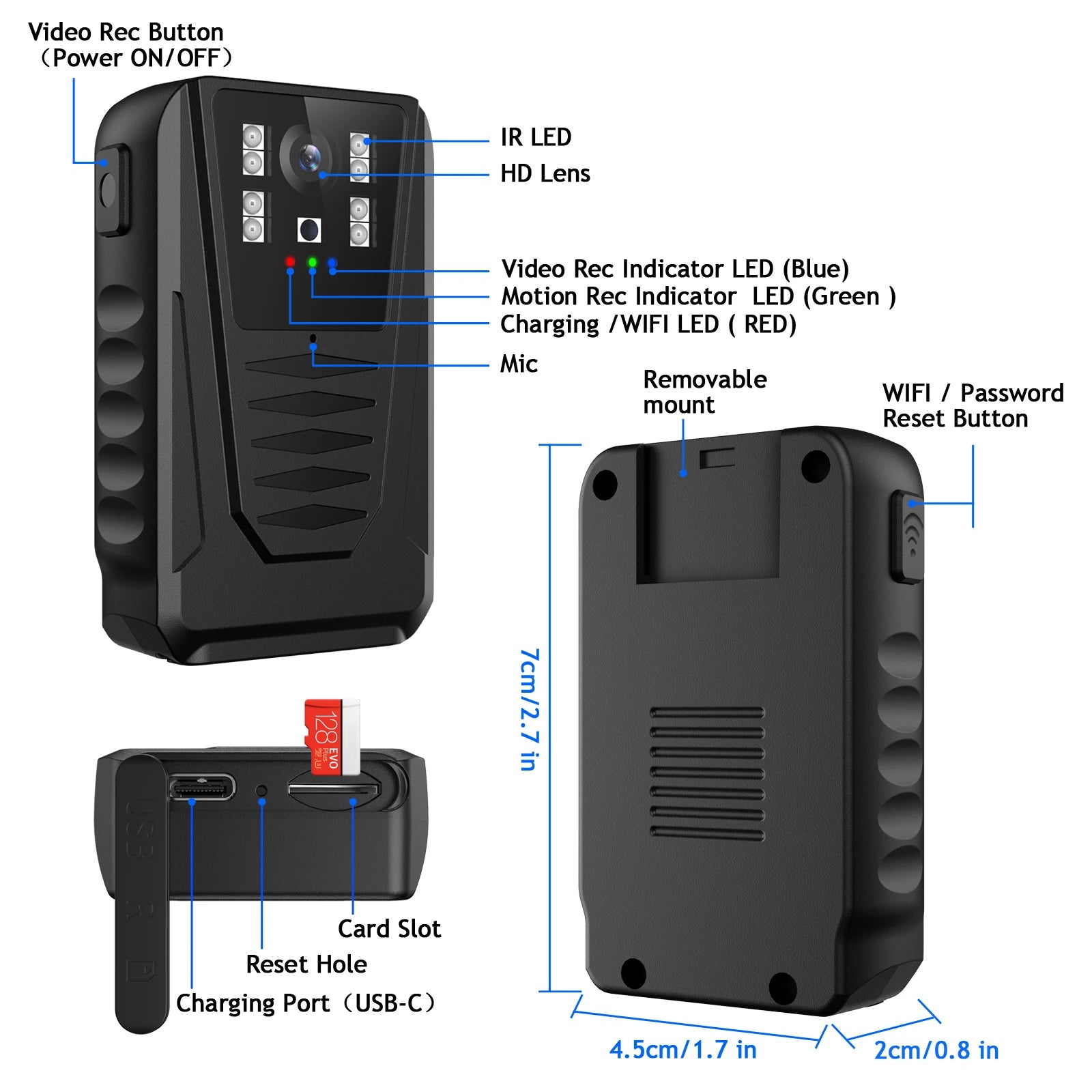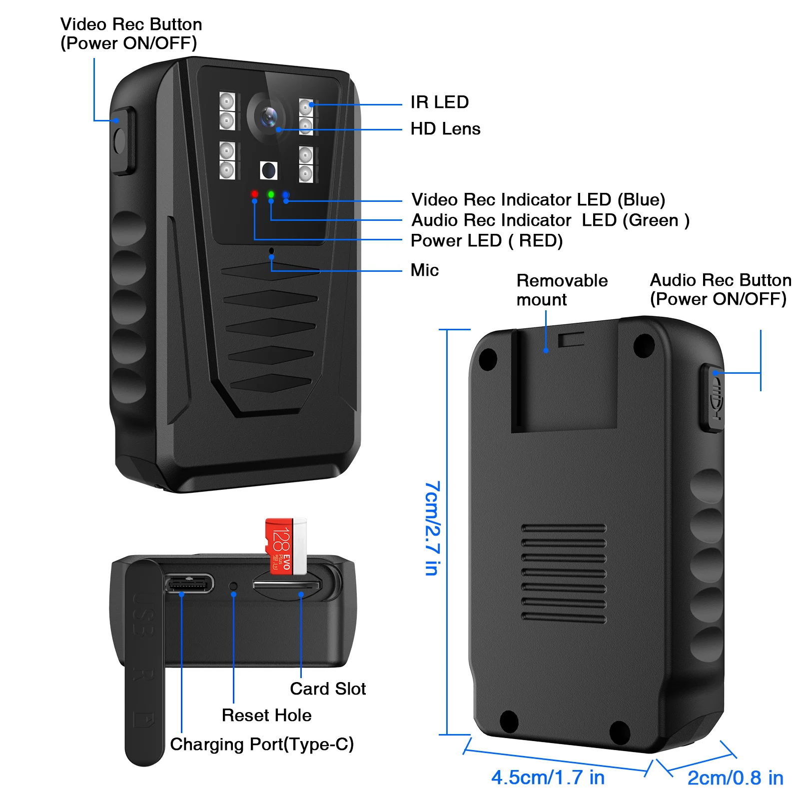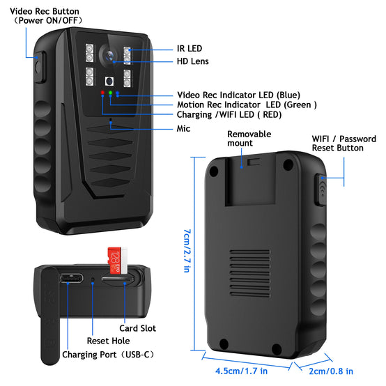 1. Multi-Purpose Camera, for body wearable; cycling ; dash camera 2. Audio recording mode and video recording mode 3. FHD 1080P 30 FPS resolution 4. 130 wide view angle 5. Auto night vision ON/OFF 6. Rechargeable battery, battery life about 5 hours 7. Max support 128GB micro sd card 8. 7/24 hours long time recording when connect with power source