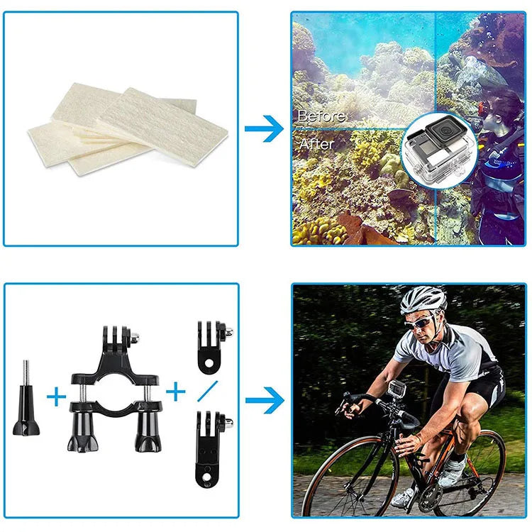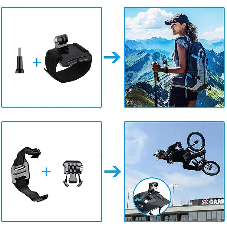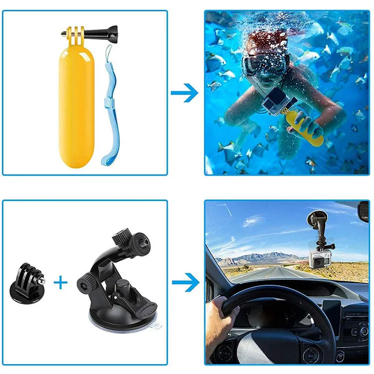 - The accessories kit is widely used in your life. It helps you take photoes and videos more easily while skiing, skating, running, cycling, boating, diving, ice hockey, surfing, etc.
