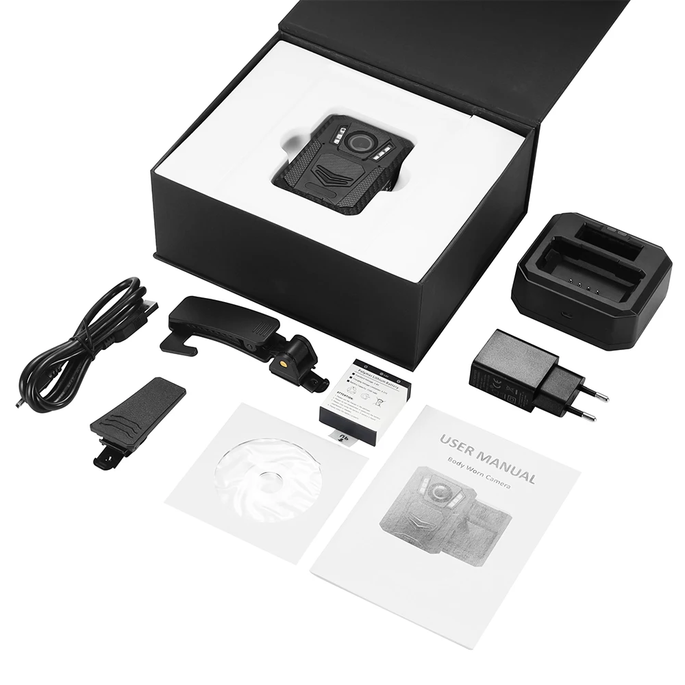 Built-in Wifi (AP and STA), GPS, 32GB TF card;With Dock Charger 1. Ambarella H22 Chipset 2. 2 inch 16:9 TFT-LCD High-Resolution Color Display 3. Removable batteries 2500mAH*2pcs, 19 hours video recording(1280x720P 30fps) 4. Video Resolution: 2688x1512 30P, 2560x1440 30P,2304x1296 30P,1920x1080 30P,1280x720 30P,848x480 30P 5.Video Format:H.264/H.265 MPEG4; Audio Format:WAV; Photo Format:JPEG 6. 5.0 MP CMOS Sensor,4608*3456 JPEG,;Photo resolution:5M/12M/20M/25M/30M/40M 7. Storage Capacity:Support MicroSD Class10 16G/32G/64G/128GB 8. 140° field of view 9. Auxiliary Light: one white flashlight 10. Water Mark :User ID, Time and date Stamp,GPS coordinates Imbedded into Video. 11.IP67 waterproof & 2 meters shock-proof 12.Password protect:To set an administrator password to allow deletion via software.User can only view the videos but cannot delete it. 13.4 IR Light, Infrared 10 meter night vision with face detect 14.Support Take picture while video recording 15.Video Format:MP4; Audio Format:WAV; Photo Format:JPG 16.Support AES(MOQ:100pcs) Dimension:78*55*32mm /174g