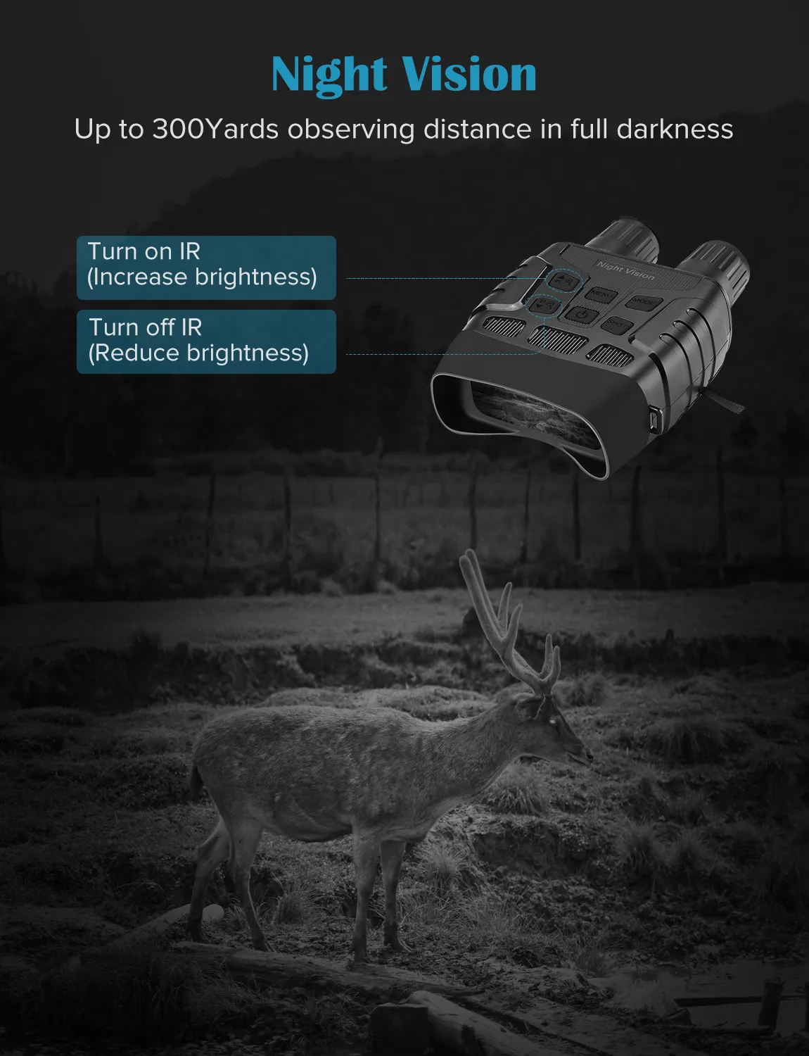 2.4x digital zoom with 7 levels of brightness adjustment, you can detect objects in the dark from 200-300 meters away.