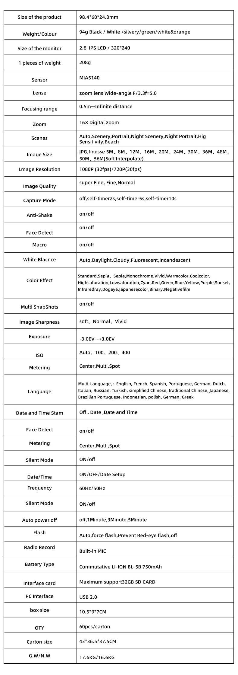 Auto/Daylight/Cloudy/Fluorescent/Tungsten