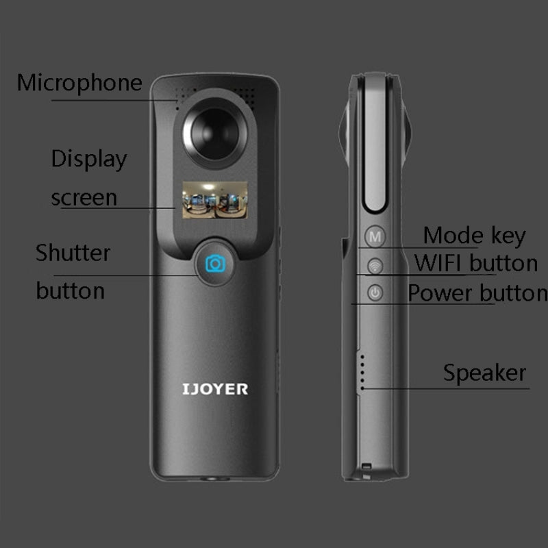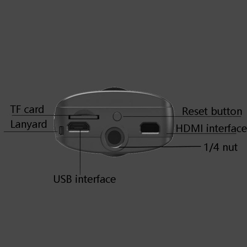 1. Material: ABS, electronic components 2. Display mode: Normal mode, 360 mode, quadruple mode, asteroid mode 3. Support languages: Simplified Chinese, Traditional Chinese, English, Japanese, Russian, French, German, Spanish 4. Additional features: Recording function, support WIFI 5. Sensor type: CMOS 6. Optical zoom factor: None 7. Sensor pixel: 13 (million) 8. Aperture: F2.8 9. Photo resolution: 6112x3056, 3840x1920, 2880x1440 10. Video resolution: 3840x1920@30fps, 2880x 1440@30fps, 1920x960@ 30fps 11. LCD screen size: 0.96 inches 12. Whether touch screen: Non-touch screen 13. Lens: Double fisheye lens 14. Storage medium: Microsd (TF) card 15. Storage standard: U3 and above 16G-32G genuine TF (micro-SD) card 16. Static effective pixels: 3200 (million) 17. Horizontal resolution: 720 18. Microphone: Stereo 19. Anti-shake performance: No anti-shake 20. Whether to support night shot function: Not supported 21. USB interface: USB 2.0 22. Other interfaces: HDMI, USB wire control 23. Built-in battery: 1200 mAh lithium battery 24. Camera battery life: 2 hours 25. Appearance size: 13 x 4.5 x 2.3 cm 26. Net weight: about 100 grams