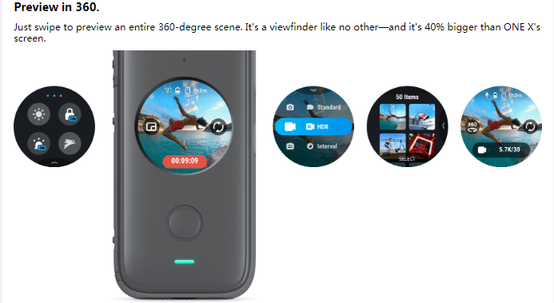 5.7K 30FPS Video & Photo: 360°panoramic and wide angle 5.7K@30fps video and 6080x3040 photo are accessible, with touchable round LCD screen for preview and easy operation.