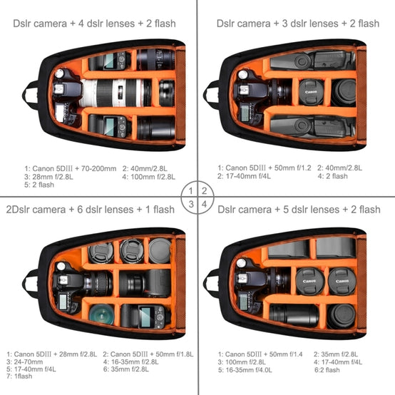 3. Can load digital SLR camera body, as well as lens and 1-2 additional lens and accessories.