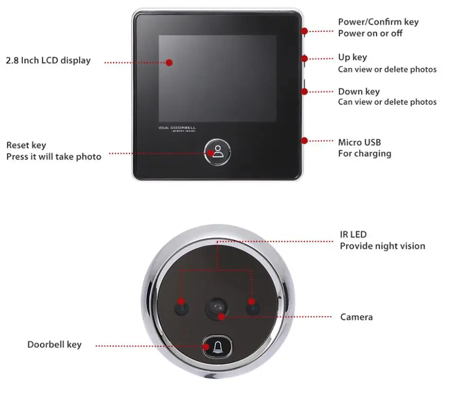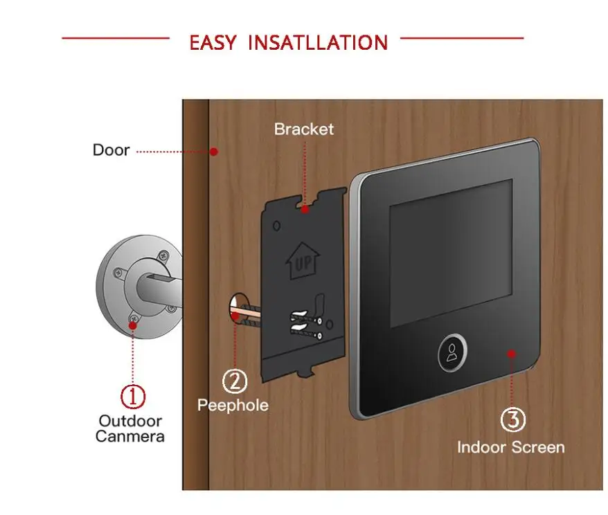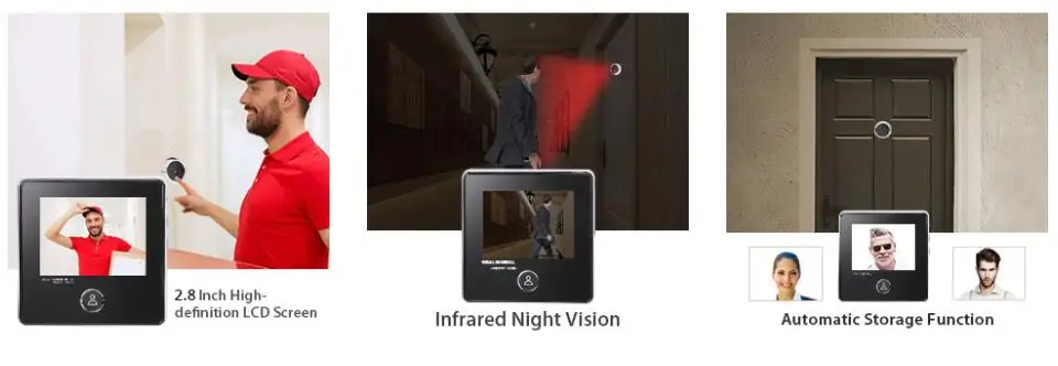 This door viewer is made of ABS plastic, with 3.0 inch screen and 0.3MP camera, which will help you to monitor door outside clearly.