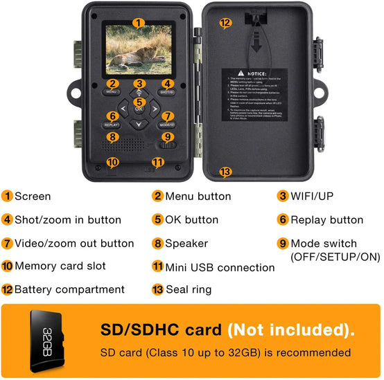 • Main functions: photo, video, burst shooing, Interval, Password, Camera name, Timer, Time lapse, Battery indicating and Auto power off