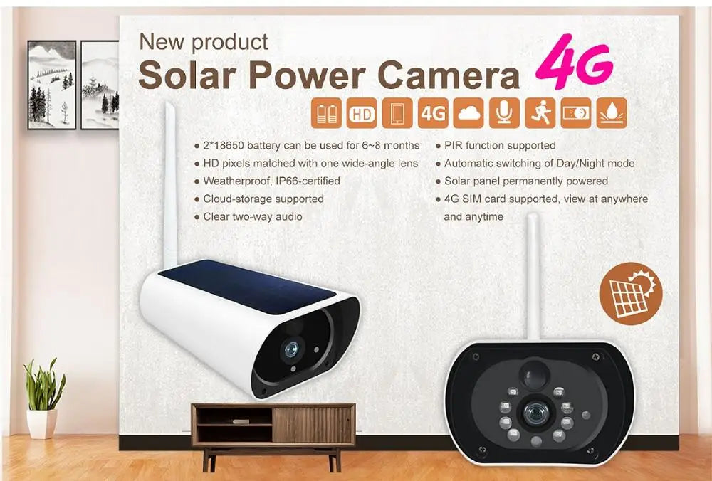 · Solar Camera 4G or Solar WiFi Camera: 4G camera equipped with solar panel , no need extra solar panel, and you to plugin a 4G SIM card for network connection