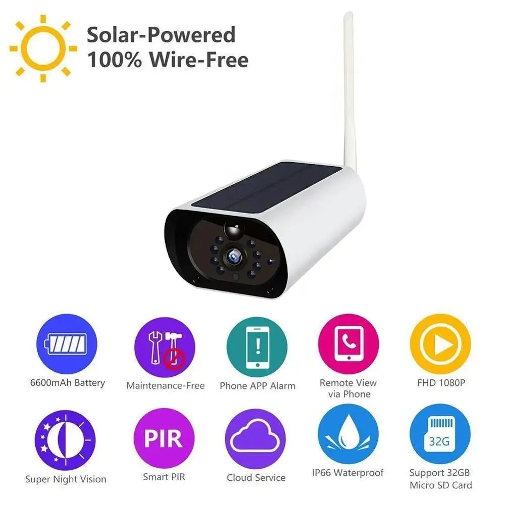 · 1080P Video, IR Night Vision, PIR Metal Housing IP66 Waterproof, solar powered with 2*18650 batteries,100% wire free, not only for home security but also suitable for car security.