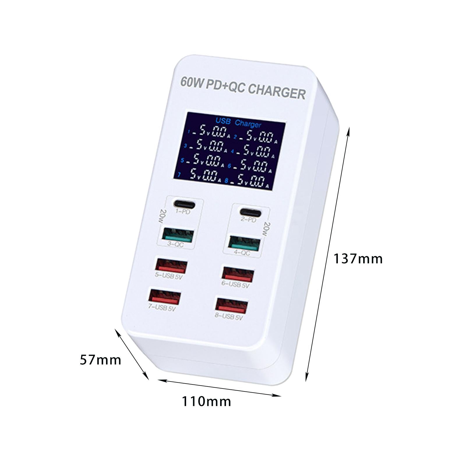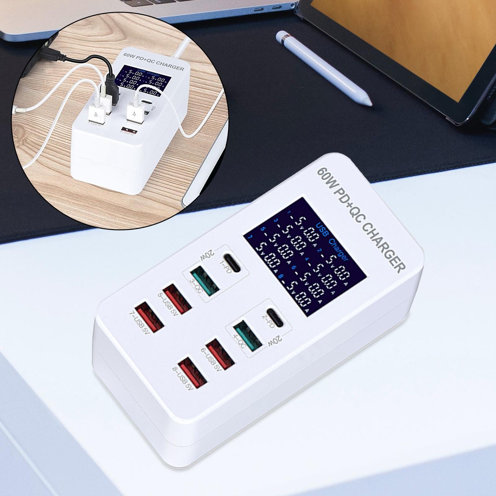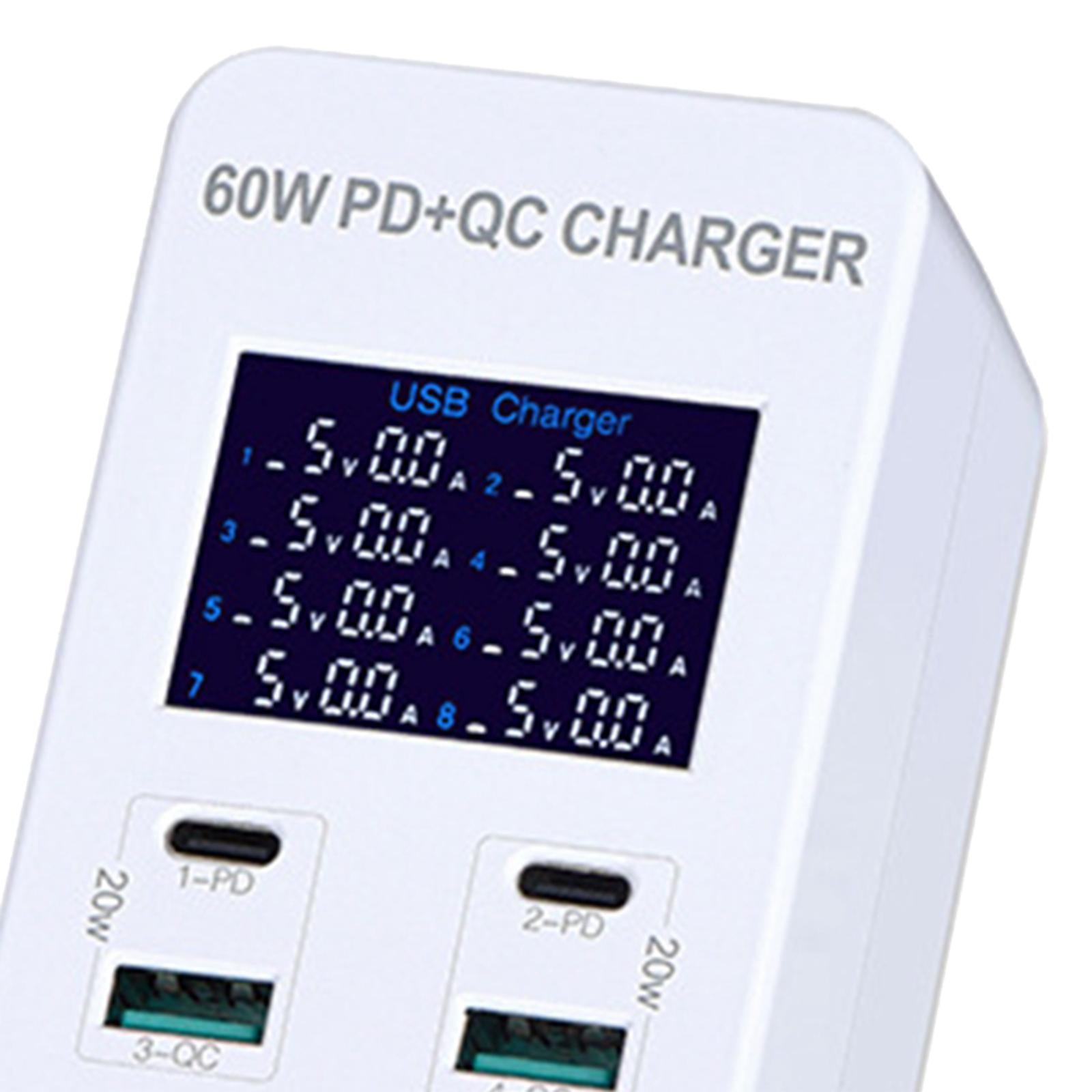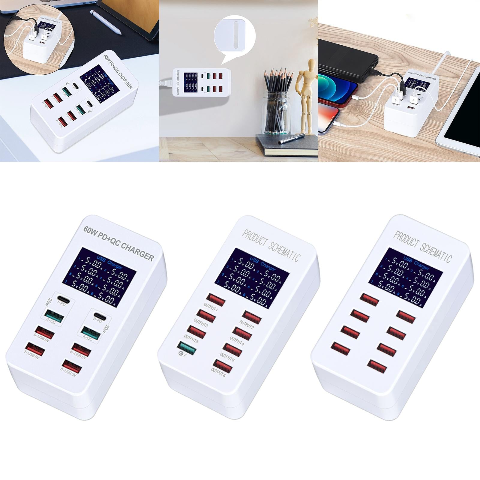 - Multi Port USB Charging Station:This USB charging station supports 8 Ports Charging to charge 8Pcs devices, with 2Pcs quick Charge 3.0 USB Port and 2 USB c, 4 USB 2.0 Ports, with a shared total maximum of 60W.