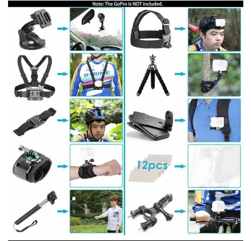 • The accessories kit is made with high quality materials. The kit can hold the action camera safely.