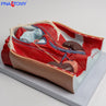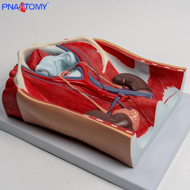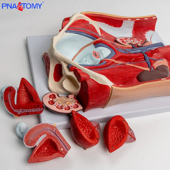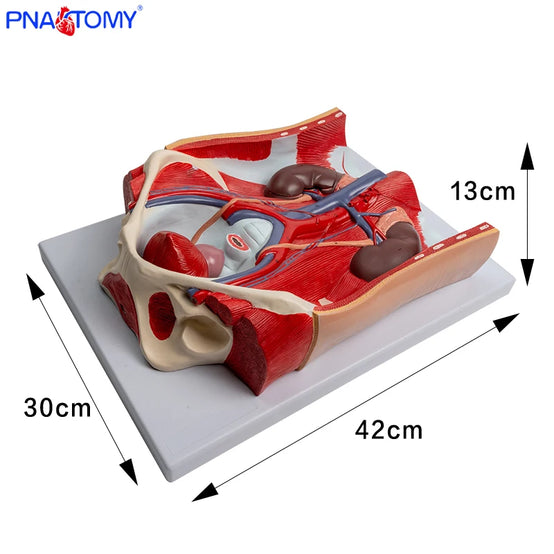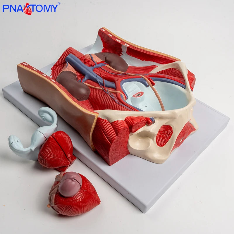 This model consists of 6 components, displaying structures such as the kidney, ureter, bladder, and uterus. The right kidney is opened to show the internal structure of the kidney, while the bladder and uterus can be opened to show sagittal views. The posterior abdominal wall and other blood vessels and muscle structures are also displayed. Equipped with instructions.