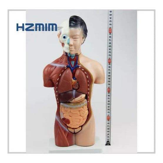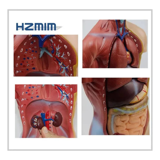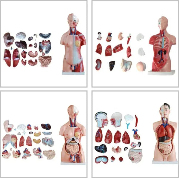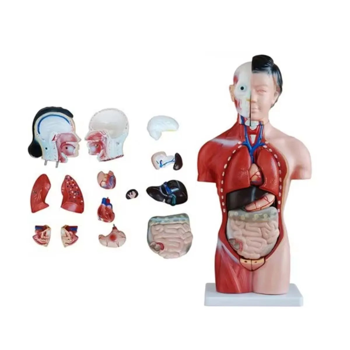 1. This is a female torso model with 15 internal organs: torso, head(2 pieces), brain, lung (2 pieces), heart (2 pieces) brain, stomach, liver, pancreas and spleen, kidney, intestines and female reproductive organs (2 pieces).