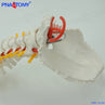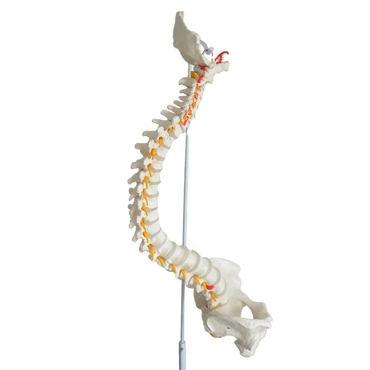 A fully flexible life size vertebral column consisting of the occipital plate, cervical, thoracic and lumbar vertebrae, sacrum, coccyx, complete pelvis with symphysis. The model also features representations of the vertebral arteries, spinal nerve branches and a prolapsed L3-L intervertebral disc.