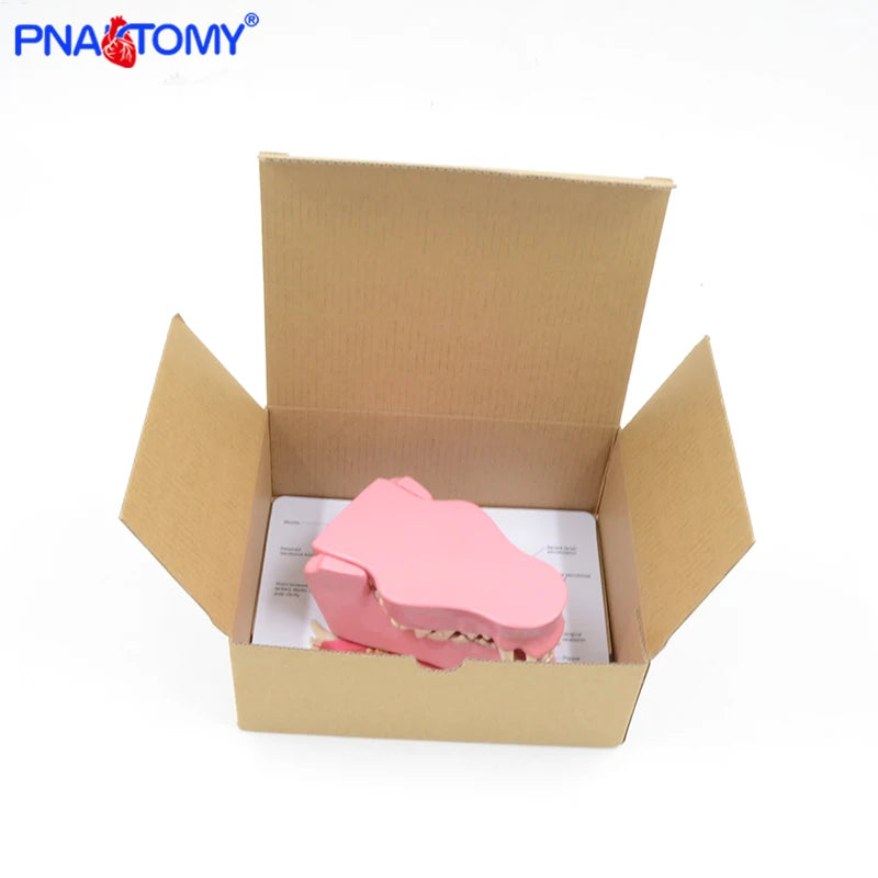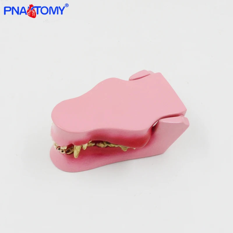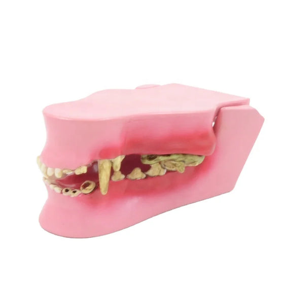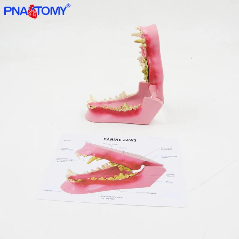 Average size canine jaw depicts healthy teeth on the right side and diseased and damaged teeth on the left. Featured pathologies: fractured canine, periodontal disease,tartar accumulation, plaque, gingivitis, worn incisors, retained deciduous tooth, missing premolar and (canine) gingival recession. Jaws open, close and separate for closer study.