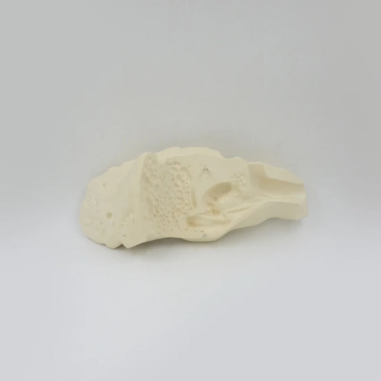 Description:Magnified 5 times, 2 parts, showing the shape of the temporal bone, the holes, fissures, and tubes on the surface are disassembled to show the external auditory canal, the walls of the middle ear and the fine structure of the inner ear.