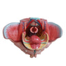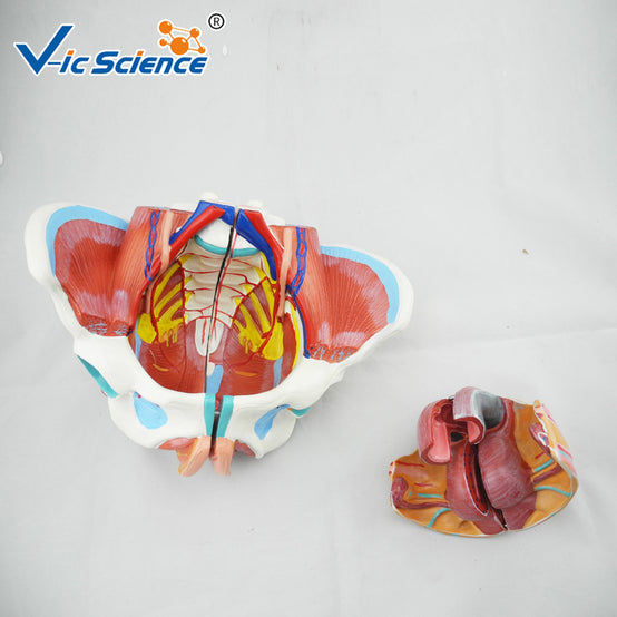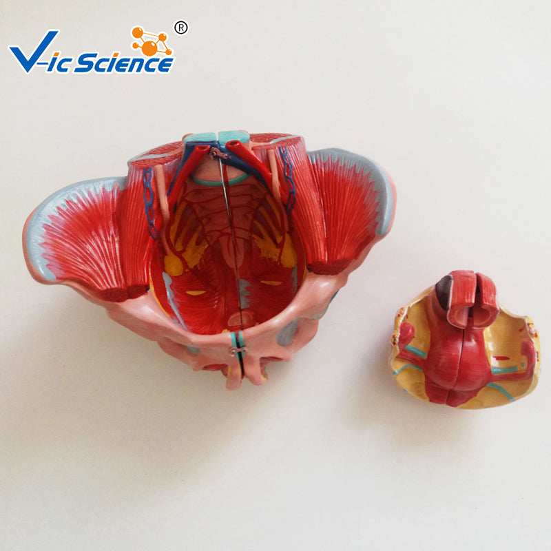 This model is painted in lifelike color. It shows all the interior and exterior female organs, blood vessels, ligaments, nerves, muscle structures within the framework of the bony pelvis. Life size.