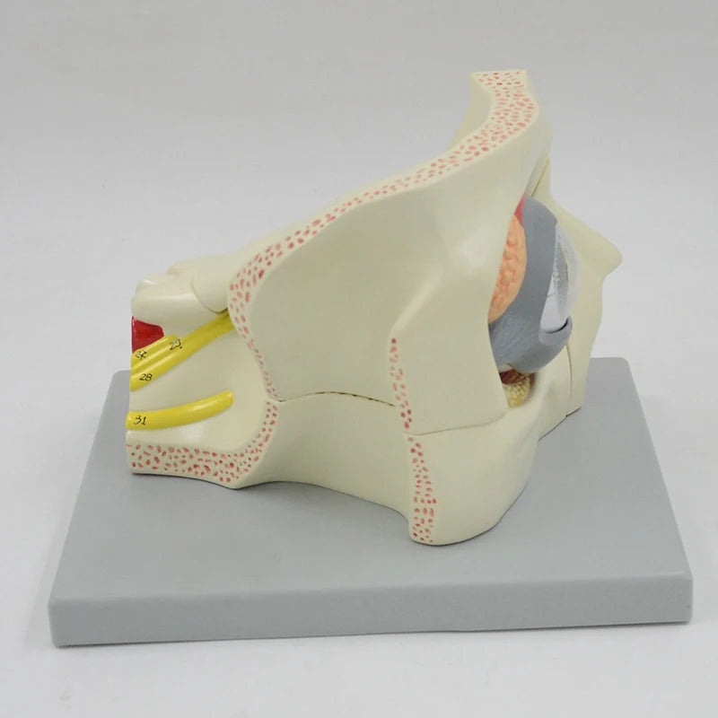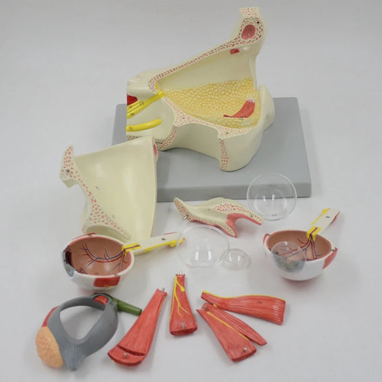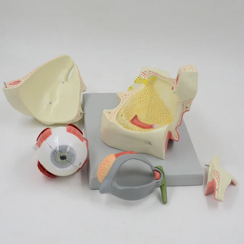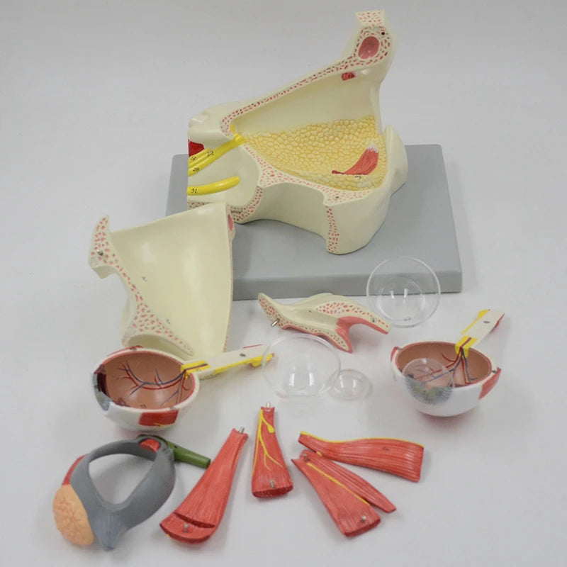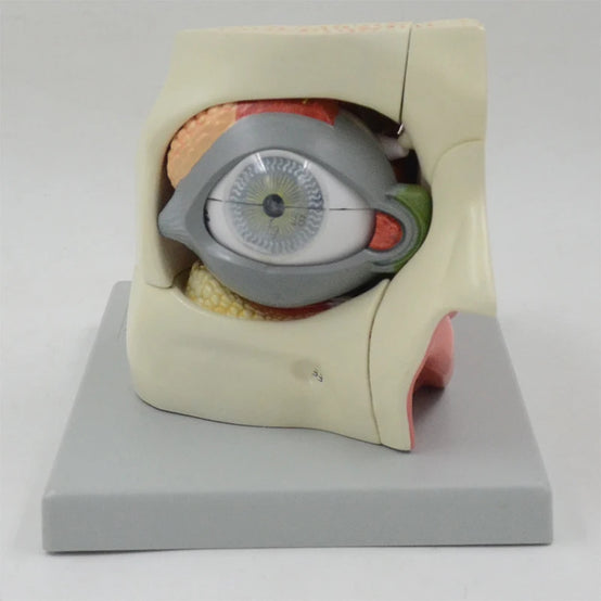 This 13- part model, enlarged approximately 2,5X life-size, shows the anatomy of the human eye. The orbit can be opened into 3 parts to reveal the internal structures: