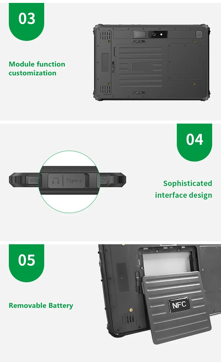water, and a battery will last up to 10 hours. Internally, it has 4GB of memory, 64GB of storage, a 10000mAh removable battery, and supports TF cards up to 128GB. It runs Android 10 OS.It has built-in 4G LTE, and supports GPS and NFC and 2D barcode optional,which combines powerful computing with ultimate reliability in the toughest environments. Below you can check more details of it.