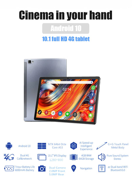 This tablet uses HD IPS screen. The screen size is 10.1 inches and the powerful processor works: 4GBRAM + 64GB of high-performance ROM for 2.0GHz Octa-core tablets let you read and watch HD videos smoothly. Android 10.0 dramatically improves tablet performance you can smoothly browse online or download Android apps without any concern on the compatibility.