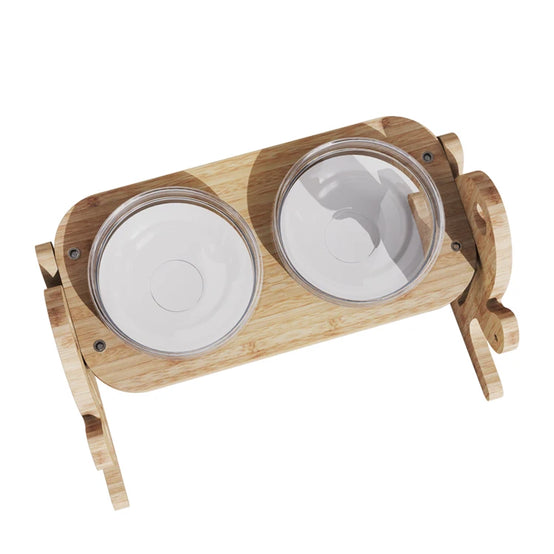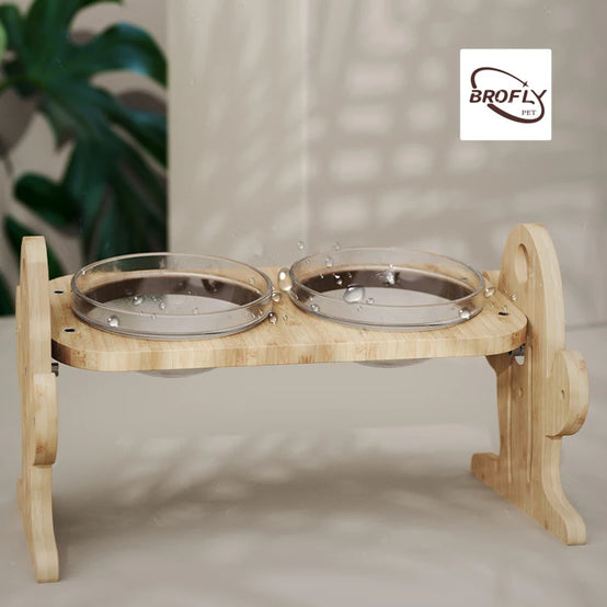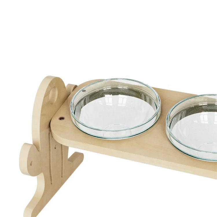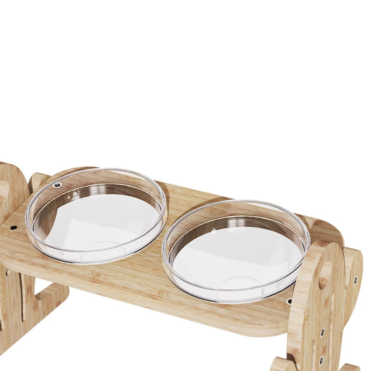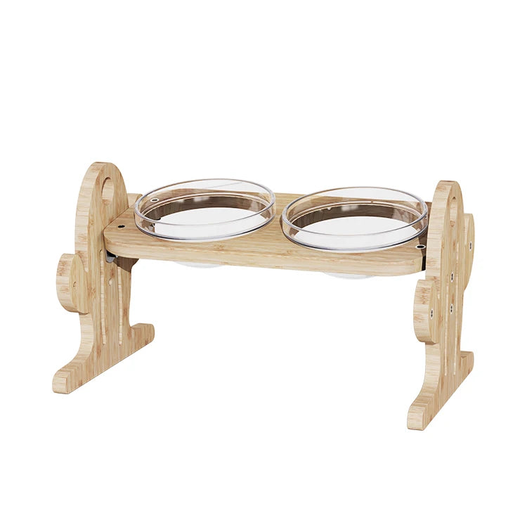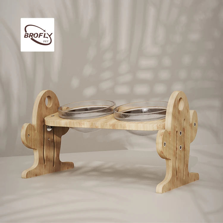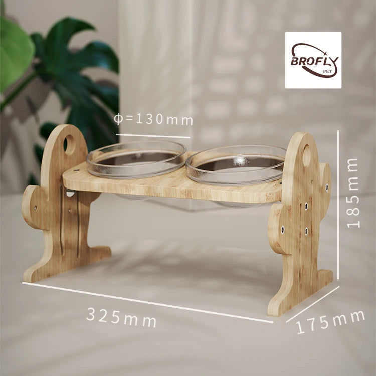 elevated bowls, tilted, height adjustable, bamboo wood cactus stand, double glass bowls, easy to clean, large capacity, waterproof