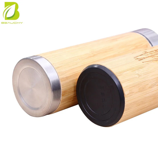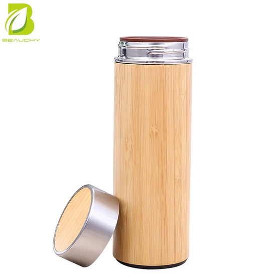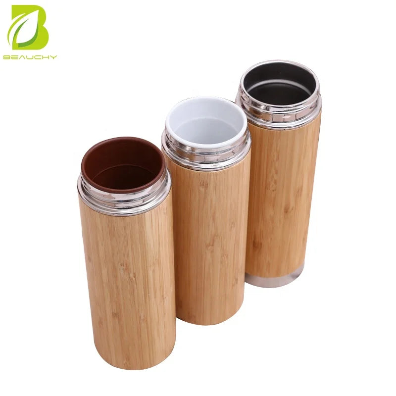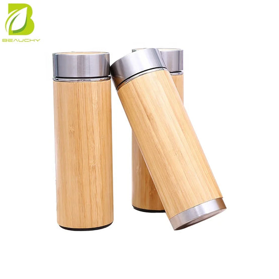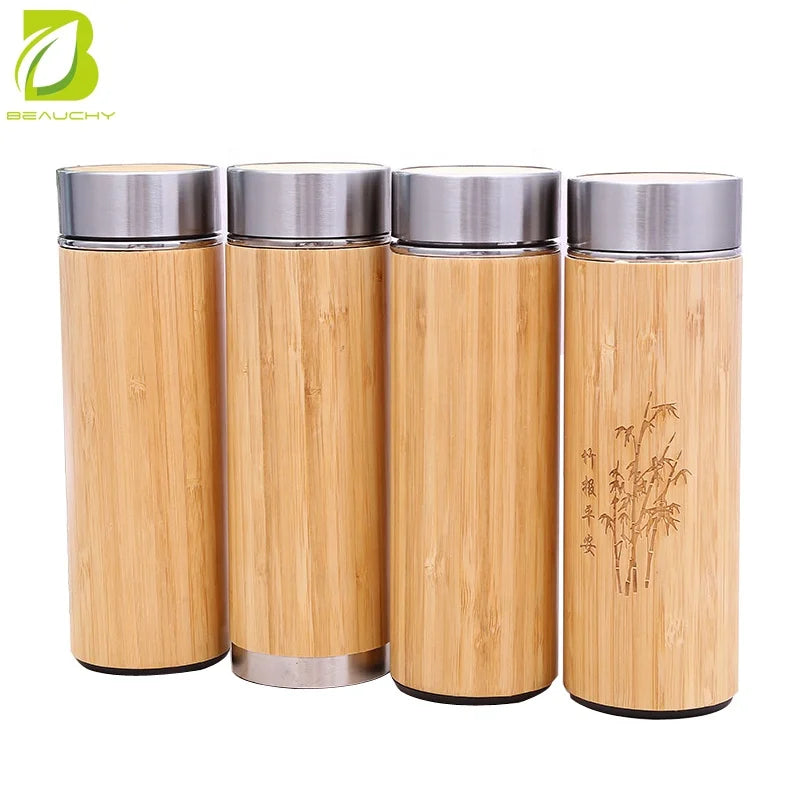 300/400/500ML Wholesale double wall stainless steel bamboo water bottle, bamboo thermos