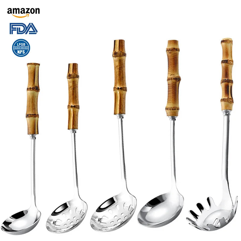 bamboo handle hot pot soup spoon scoop dipping shell leakage soup cooking wooden utensils set Soup Shell colander soup ladle