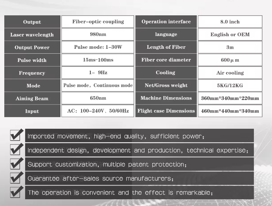Endogenous laser treatment (EVLT) according to the characteristics of the thermal energy of the laser and the laser effect of the tissue, the laser emitted by this instrument through a fiber-coupled light source is conducted through a special circular fiber to accurately destroy the inner wall of the blood vessel, achieve blood vessel closure and fibrosis, and achieve the purpose of treating varicose veins of the lower limbs. The laser in this band has a high absorption rate of melanin and deoxyhemoglobin, and it has the effect of coagulation and hemostasis while vaporizing and cutting.