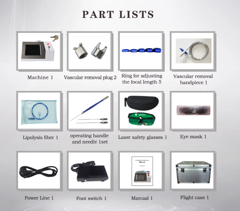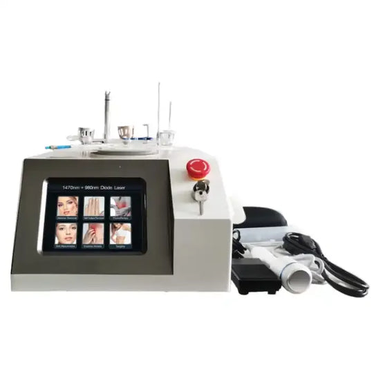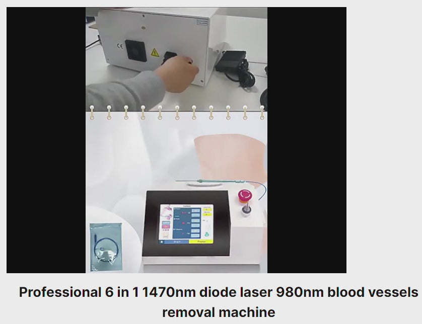 The 1470nm & 980nm 6 + 1 diode laser therapy device uses 1470nm and 980nm wavelength semiconductor fiber-coupled laser for vascular removal, nails fungus removal, physiotherapy, skin rejuvenation, eczema herpes, lipolysis surgery, EVLT surgery or other surgeries, and add functions of ice compress hammer.