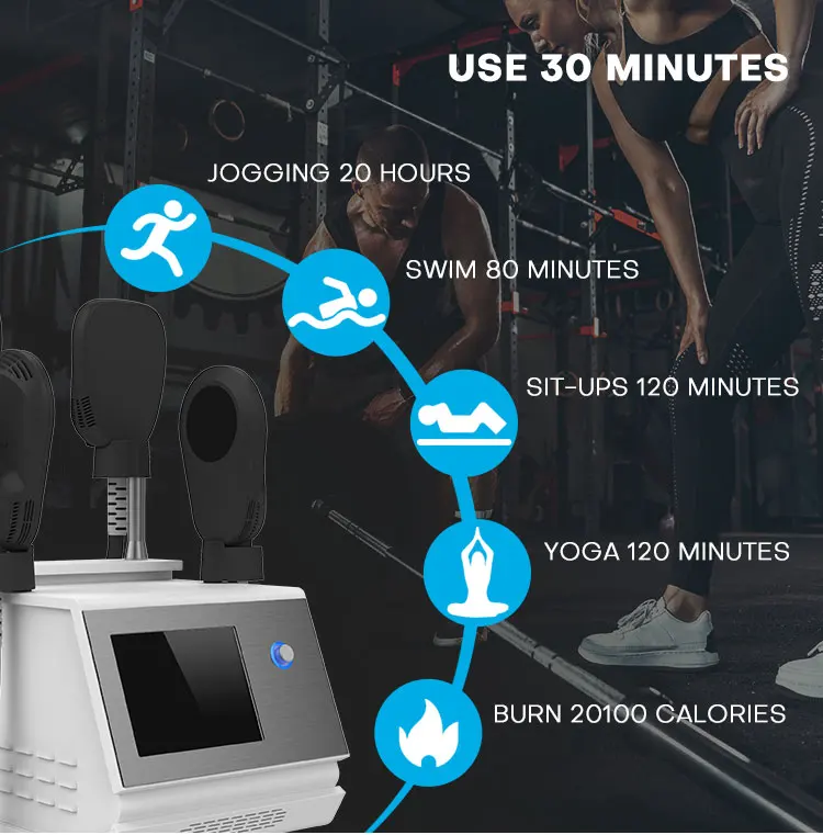 FUNCTIONS EMS RF machine Helping Reshape Bodies Without Exercise 30% reduction of fat 4 cm (1.5 inches) loss in waistline circumference 25% increase in muscle mass 11% reduction in abdominal muscle separation (called diastasis recti) 5 x increase in fat metabolism (apoptotic index increased from 19% to 92% after treatment) 80% patients with visible lifting effect of buttocks