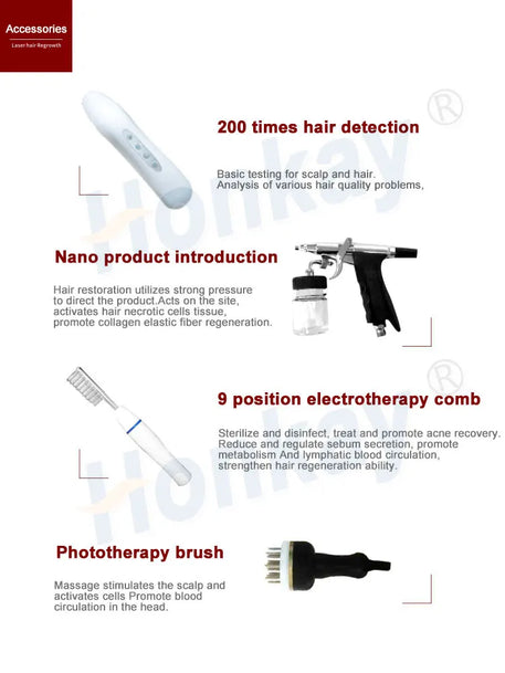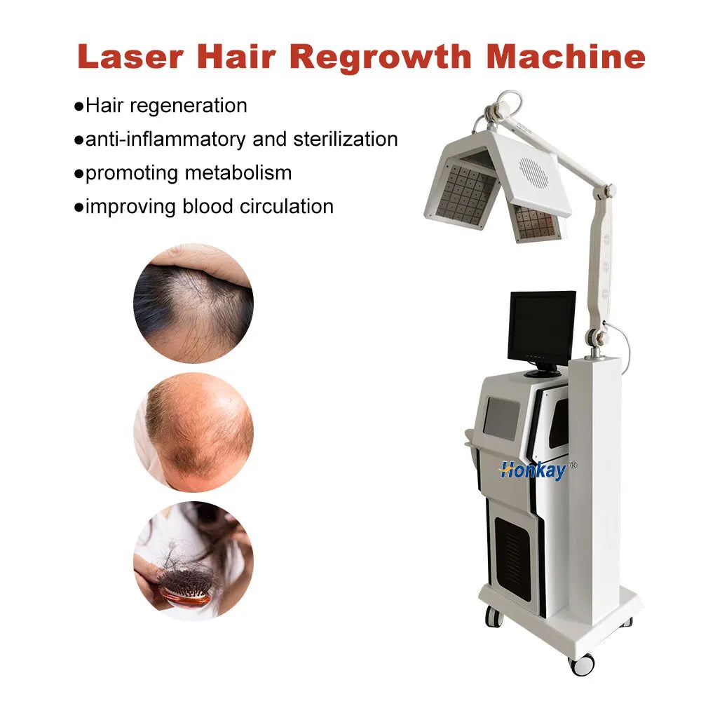 diode laser hair regrowth Working Theory Laser Hair Therapy is a non-chemical, non-invasive treatment that is being used commonly for the treatment of hair loss. (low level laser therapy) is delivered by a device that contains panels of lasers that shine on the scalp. It is high-end laser hair loss treatment system, based on 660nm low level diode laser technology. The therapeutic light - energy is absorbed by the cells and the process of cell repair begins, it stimulates the production of energy at the cellular level, therefore, improving cell function. Low Level Lasers are referred to as “cold” lasers because they do not release energy in the form of heat. The light wavelength emitted from a low level laser actually will repair tissues that have impaired cellular metabolism by stimulating blood circulation, encouraging regeneration of normal healthy tissues.
