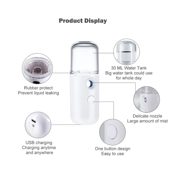 【Nano Comfort Spray】- The ultrasonic atomizer outputs a 0.3 micron comfort spray, which is instantly absorbed by the facial skin and will not spoil your makeup. Nanotechnology ultrasonic spray. Portable Pocket Size】- The mini size is easy to carry and can be freely put into pockets, handbags and backpacks, etc. 【Rechargeable and USB Powered】- Lasting for a week on a single charge, the battery in this nano spray can be charged and powered via a USB cable (included). Convenient charging via power bank and computer etc. 【Alcohol Sanitizer】- This sprayer can be used for alcohol hand sanitizer. Add alcohol with a concentration of less than 75% to the sprayer and spray it on your hands to disinfect. 【30ml Daily Use】- 30ml storage, perfect to keep your face hydrated and healthy.