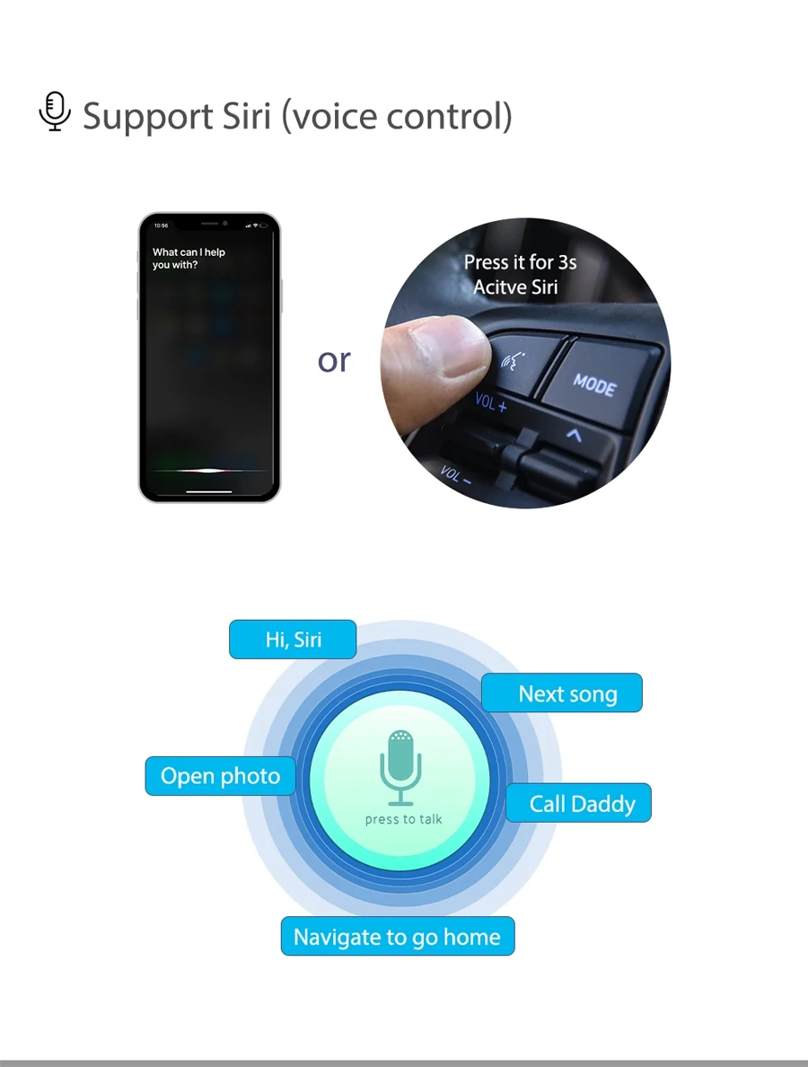 1. Work with wireless Apple CarPlay, pairing via Blue-tooth, transfer via WIFI.