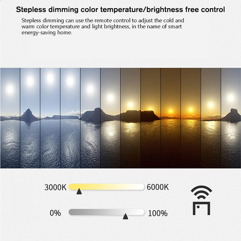 Stepless dimming can use the remote control to adjust the cold and warm color temperature and light brightness, in the name of smart energy-saving home.