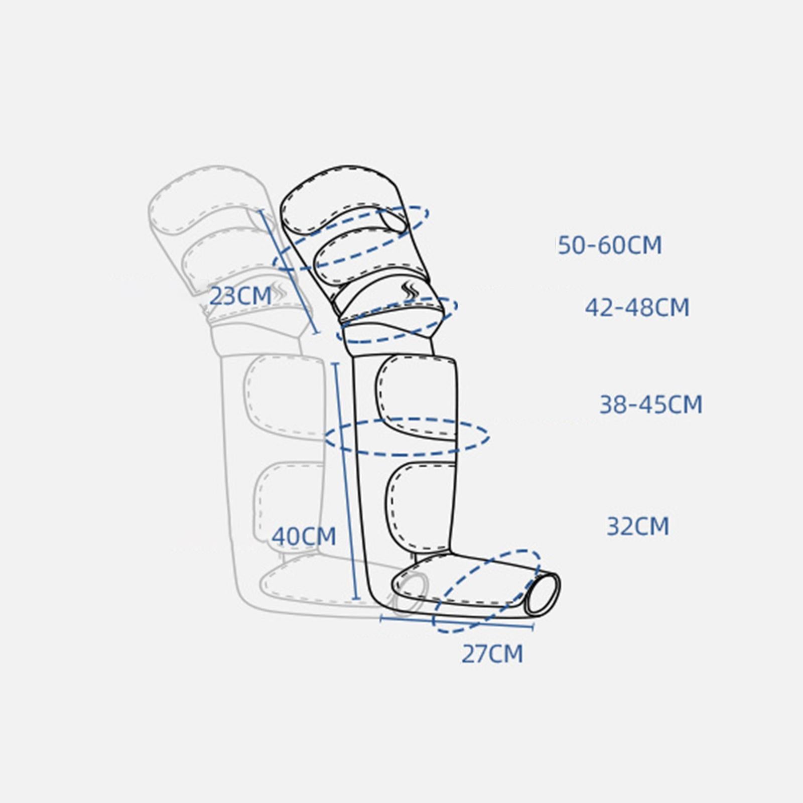 - Adjustable Air Leg Massager: calves length about 40cm/15.7inch, and thighs 50cm-60cm/19.7inch-23.6inch in circumference, foot part circumference 32cm/12.6inch, easily changed to fit on different sized people.