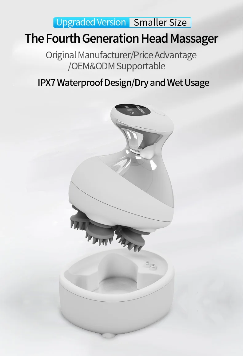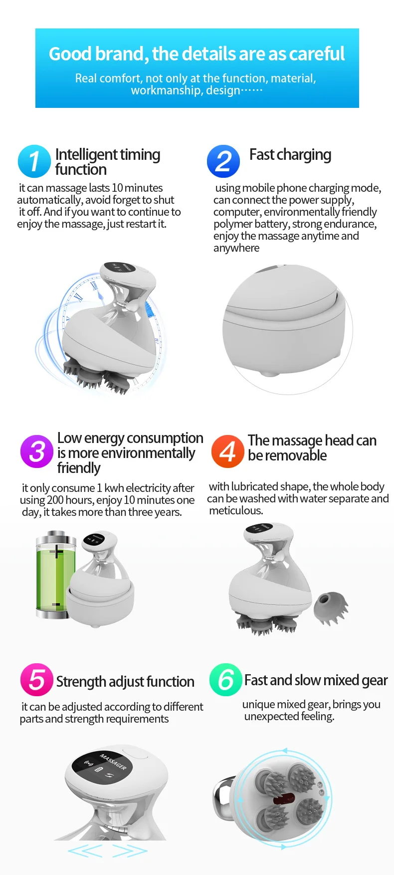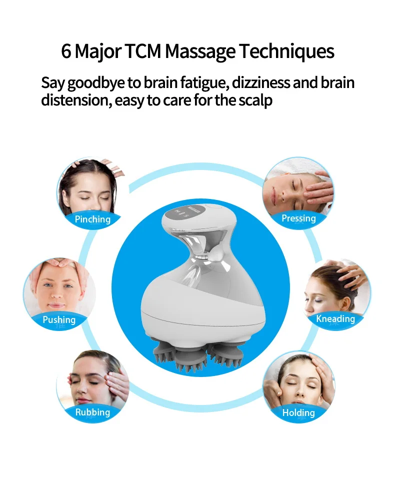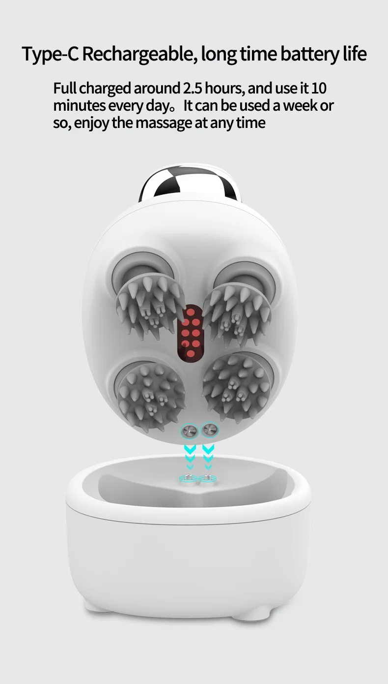 2. 6 major TCM massage techniques, promote blood circulation of head with shiatsu massage. 3. One key intelligent operation, relax body and head after working. 4. Type-C rechargeable, long time battery life.5. Silent design, enjoy the comfort. 6. IPX7 Waterproof design, you can easy to enjoy massage when washing your hair. |
