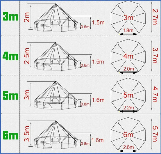 * Good ventilation: there are four ventilation holes on the top of the tent. For the 3m and 4m bell tent, there are four