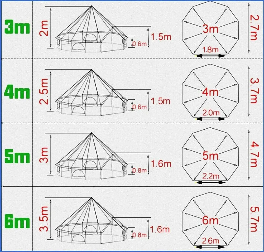 semicircular windows. While for the 5m and 6m tent, it is four rectangle windows. All door and windows are mesh screen with