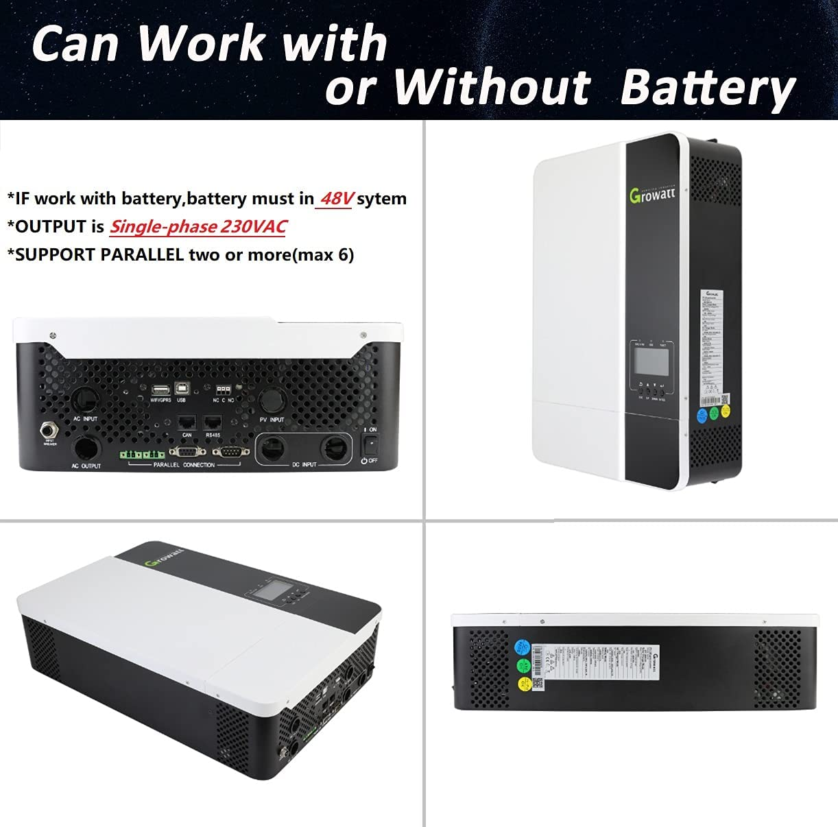 This inverter can work with or without batteries. The whole system also need other devices to achieve complete running such as PV modules, generator, or utility grid. Please consult with your system integrator for other possible system architectures depending on your requirements. The WiFi / GPRS module is a plug-and-play monitoring device to be installed on the inverter. With this device, users can monitor the status of the PV system from the mobile phone or from the website anytime anywhere.
