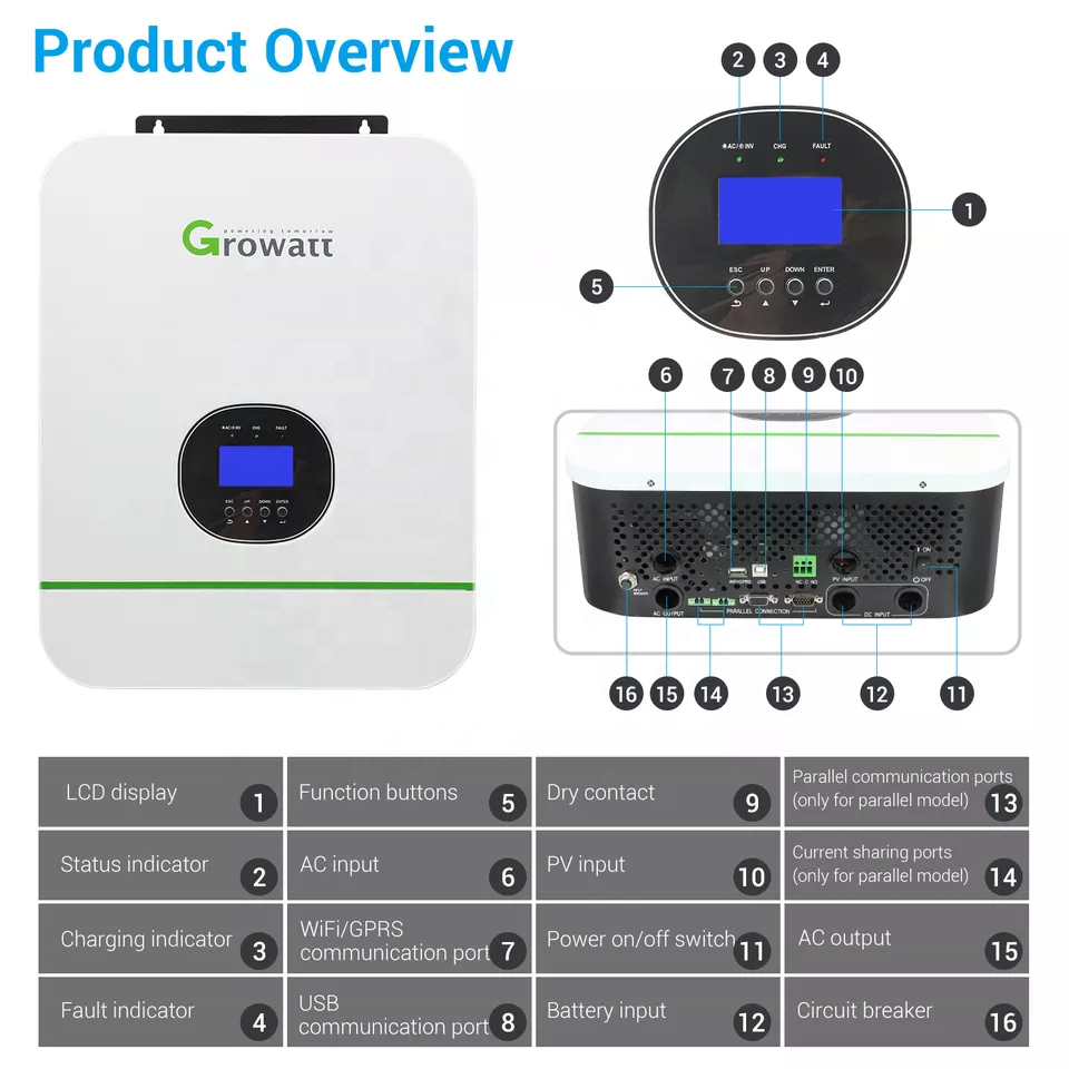 Home Use Split Phase Pure Sine Wave 48V to 110V/220V Growatt Off-Grid 3000W Solar Inverter