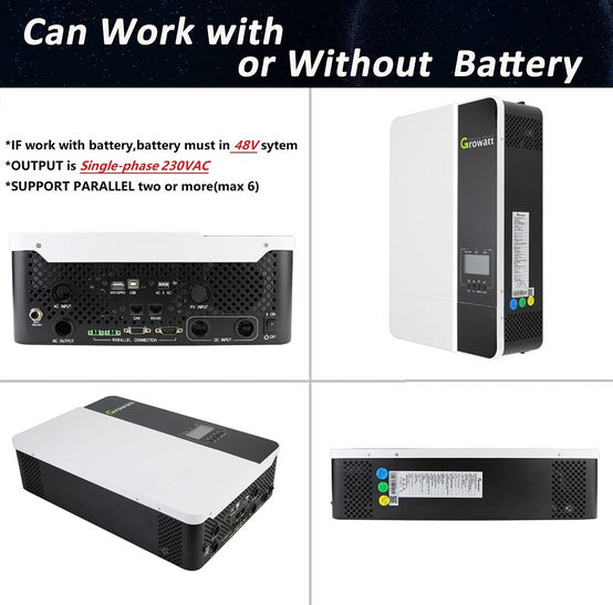 Growatt of multifunctional Off Grid Solar Inverter, integrated with a MPPT solar charge controller, High frequency pure sine wave inverter and a UPS function module in one machine, which is perfect for off grid backup power and self-consumption applications.