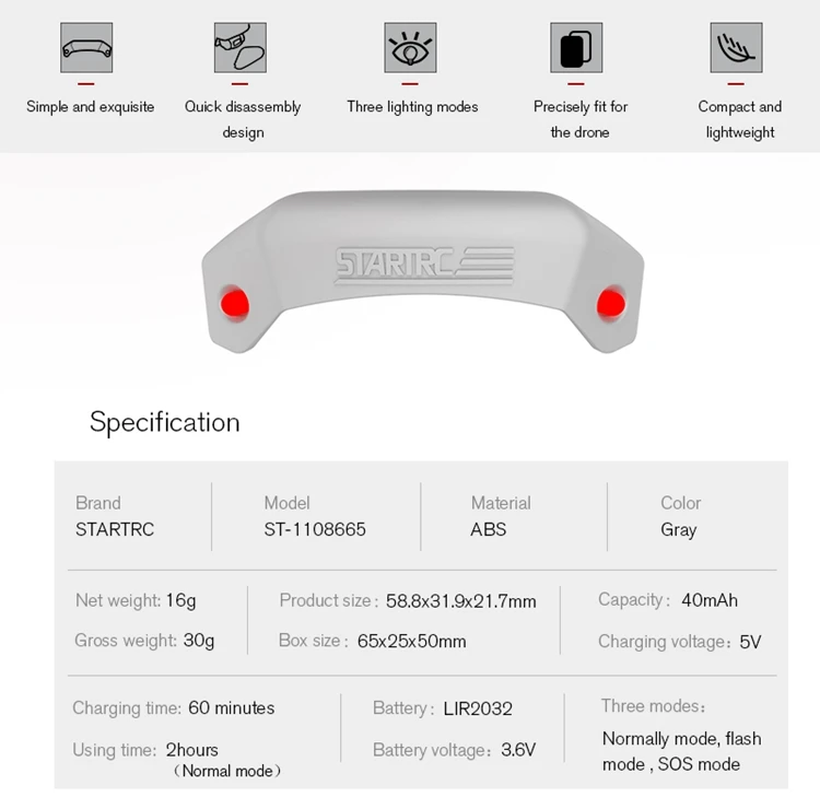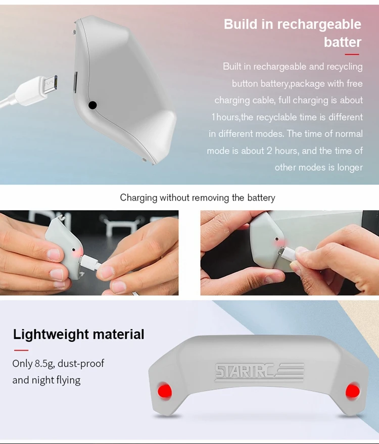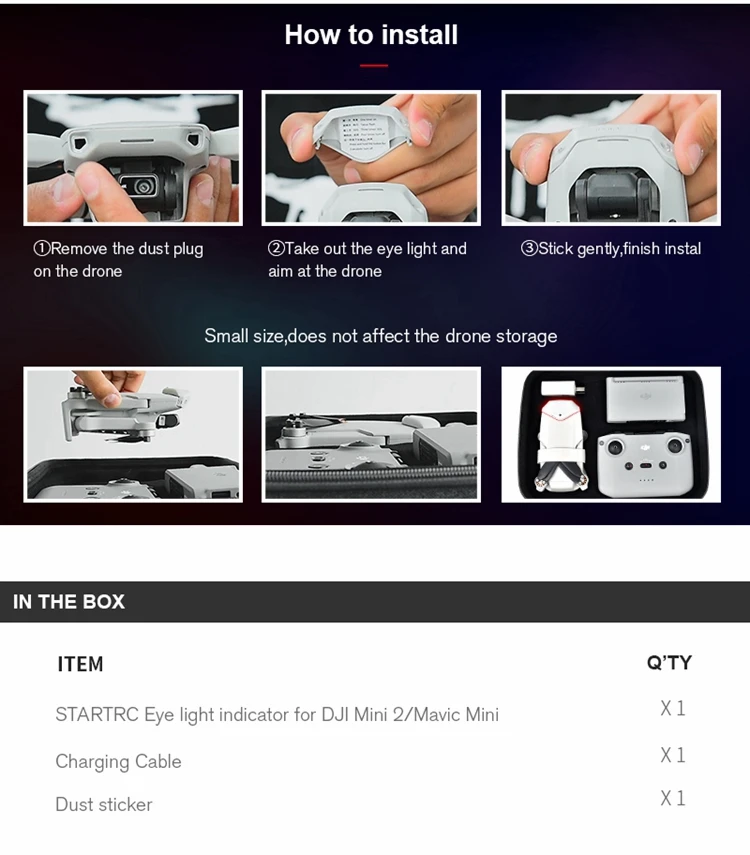 1. Use three modes of work Steady on - fast blinking -sos signal, consistent with different scene switching. (Long press 3S in any state can turn off the power, no need to press frequently, prolong the life of the key.) Warm tip: When the voltage is too low, the LED light will automatically shut down, please charge in time. 2. The eye lamp is powered by LIR2032 rechargeable battery and shipped with USB to Android charging cable, which can be used indefinitely. It is full for about 1 hour. The usage time varies with different modes. In steady on mode, it takes about 2 hours, while in other modes, it takes longer. 3. Take off the aircraft dust plug before using the eye lamp. Three dust-proof stickers are free for users to replace. 4. Fit properly with DJI Mavic mini/mini 2 aircraft, beautiful and generous, no space. Net Weight: 16g Gross Weight: 30g Product Size: 58.8x31.9x21.7mm Box Size: 65x25x50mm Capacity: 40mah Charging voltage:5V Charging time: about 1 hour Using time:2hours (Normal mode) Battery:LIR2032 Battery Voltage:3.6V Three modes:normally mode, flash mode , SOS mode