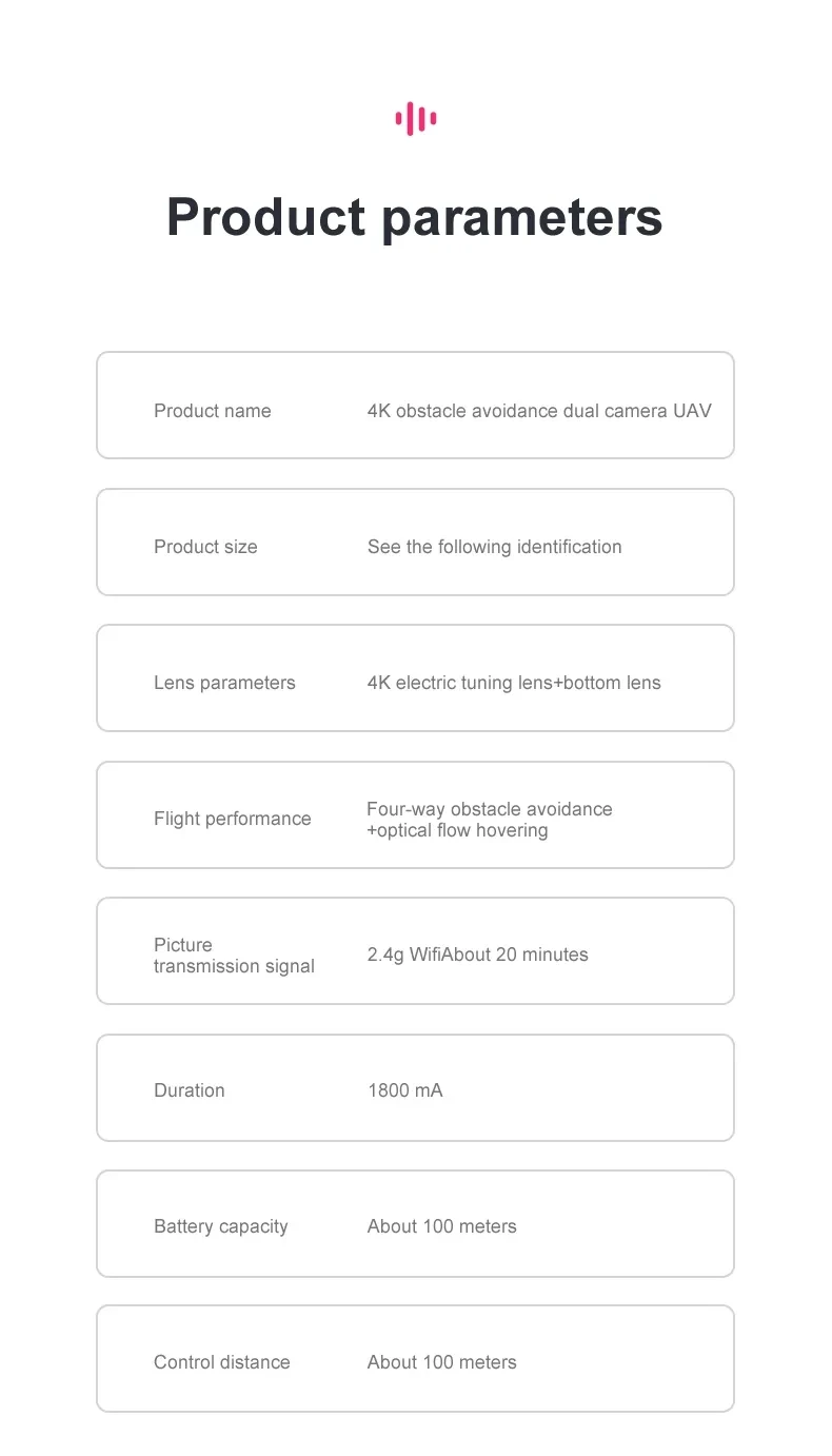 Product configuration parameters: 4K HD Dual camera/optical flow positioning/obstacle avoidance/electric adjustable camera