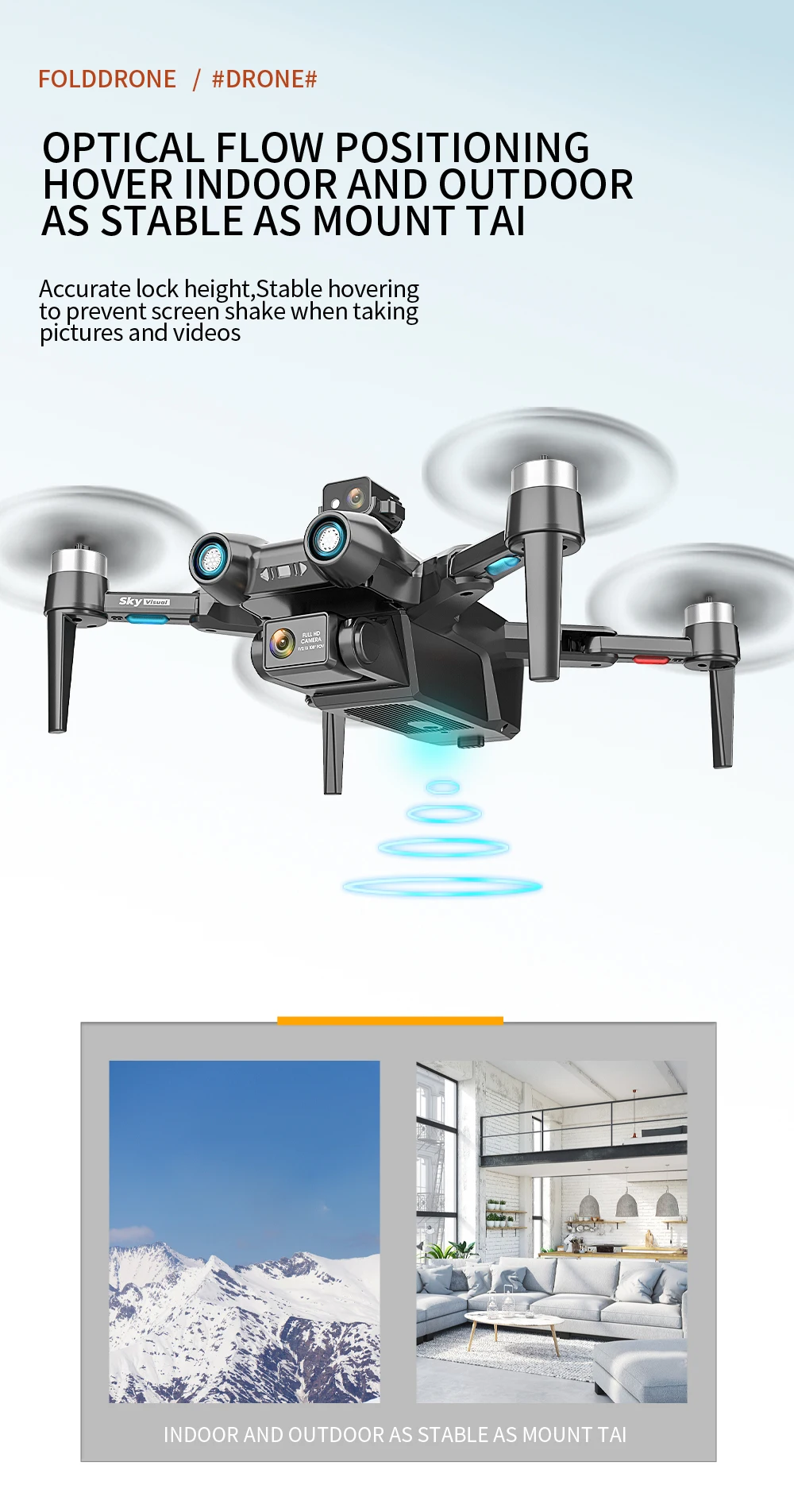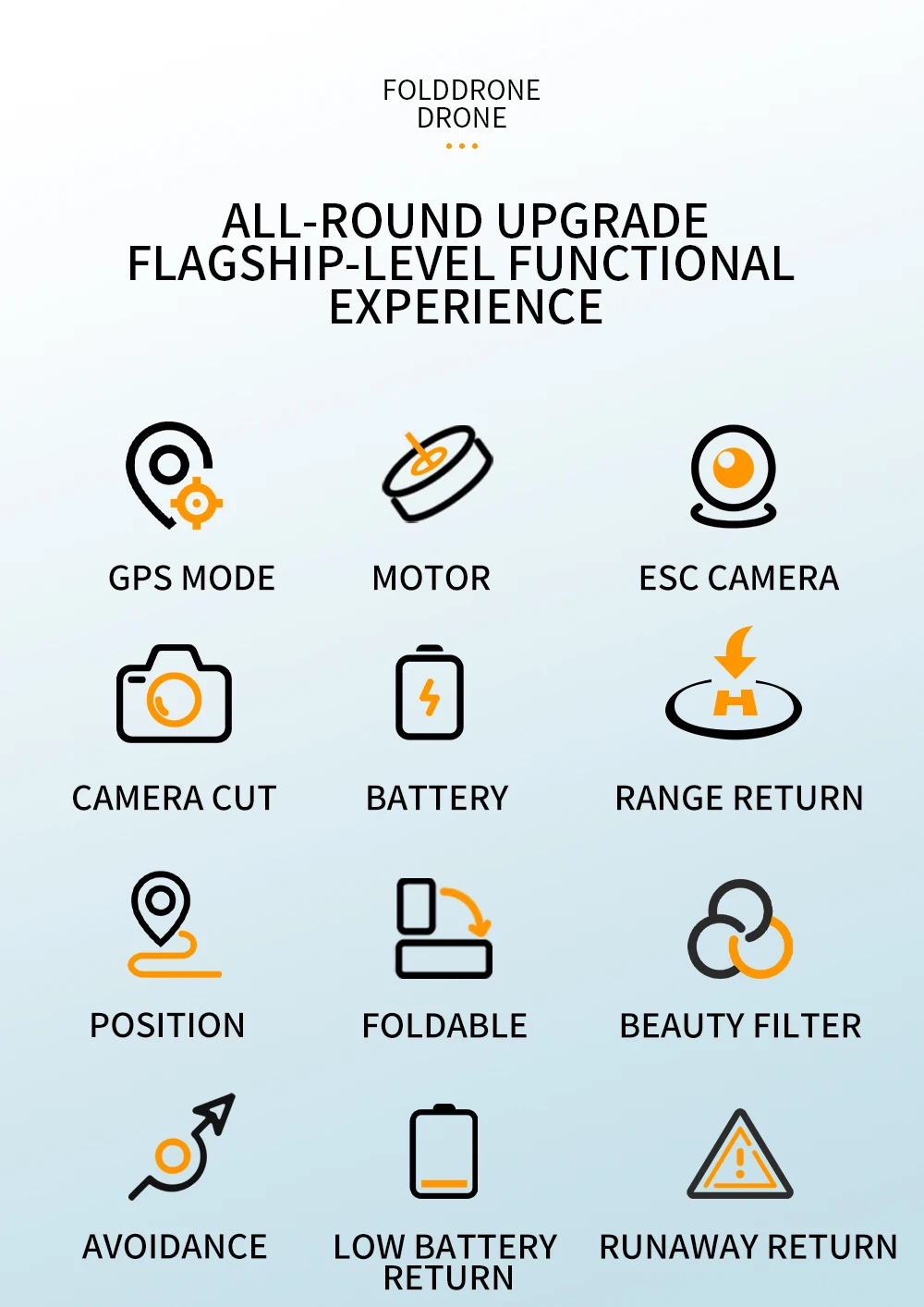 Headless mode, Altitude Hold Mode, 3D View Mode, With Camera, With LED lights, with G-sensor, 3D flip, One Key Takeoff / Landing, APP Control, Voice control, With Remote Control, Foldable