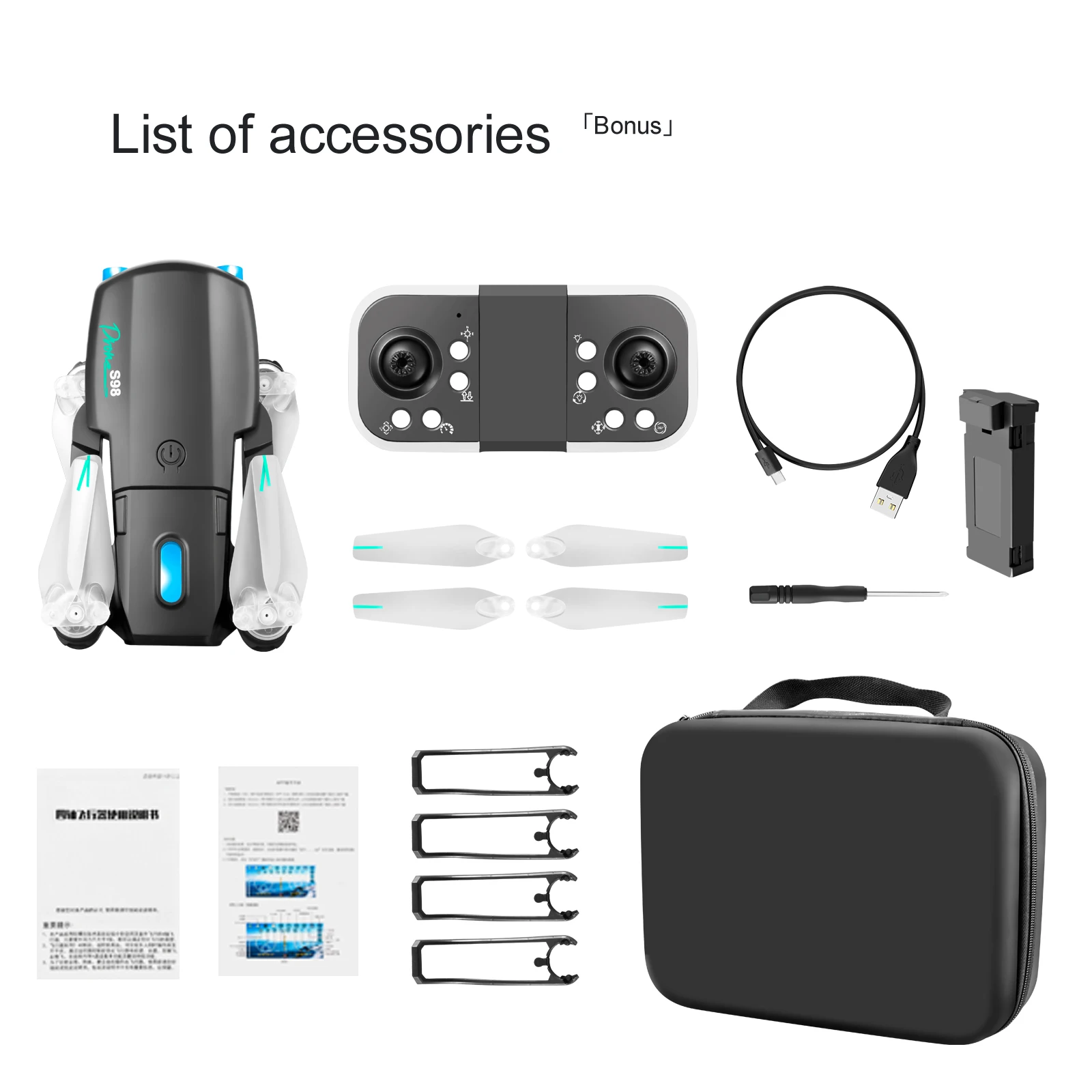 Original Box, Batteries, Operating Instructions, Charger, Remote Controller, Camera, USB Cable, Other