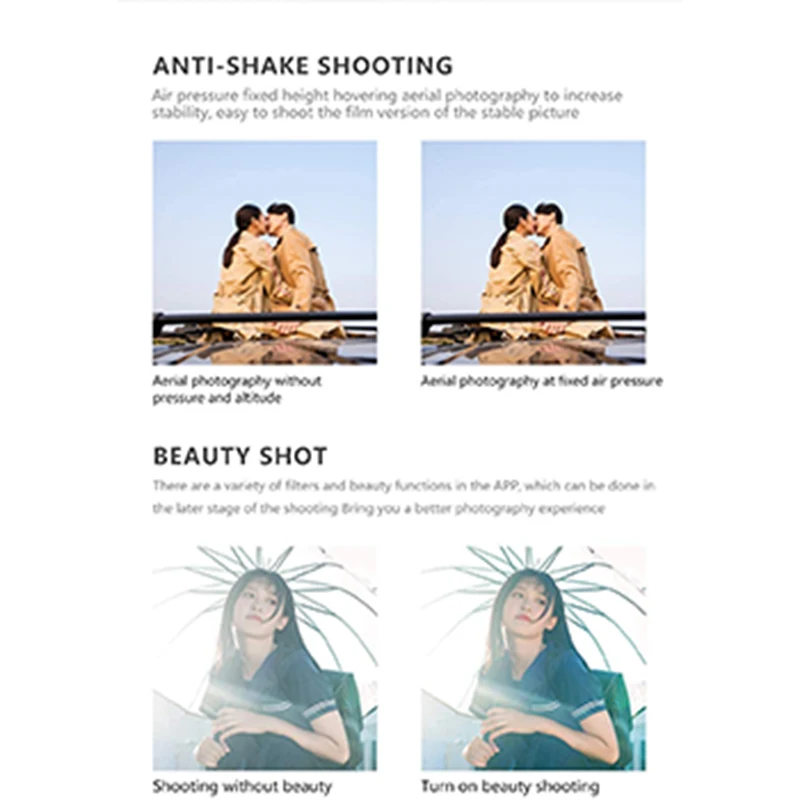 Headless mode, Altitude Hold Mode, With Camera, With LED lights, with G-sensor, 3D flip, One Key Takeoff / Landing, APP Control, With Remote Control, Foldable