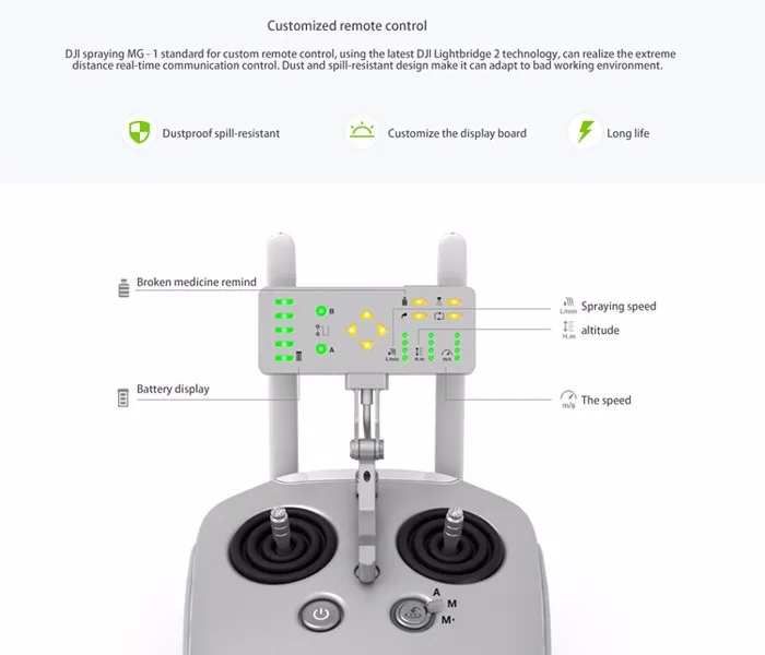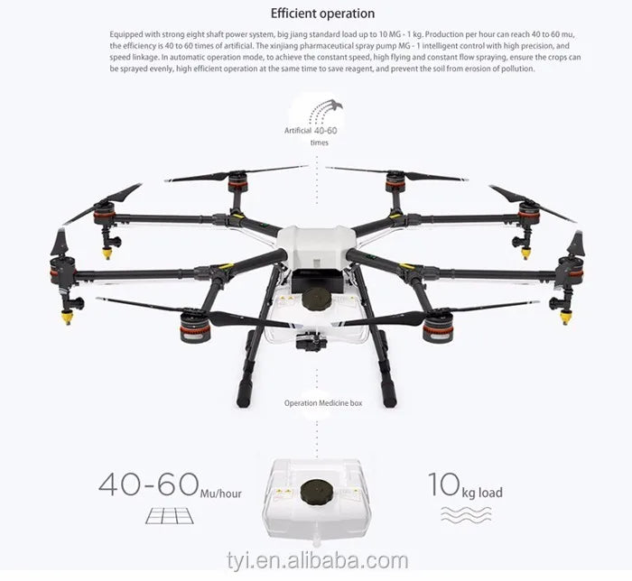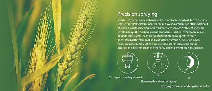 Equipped with strong eight shaft power system, big jiang standard load up to 10 MG - 1 kg. Production per hour can reach 40 to 60 mu, the efficiency is 40 to 60 times of artificial. The xinjiang pharmaceutical spray pump MG - 1 intelligent control with high precision, and speed linkage. In automatic operation mode, to achieve the constant speed, high flying and constant flow spraying, ensure the crops can be sprayed evenly, high efficient operation at the same time to save reagent, and prevent the soil from erosion of pollution.