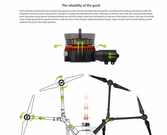 Open with new technology of agriculture in the future. DJI MG 1 designed for crop protection areas, integration of advanced flight control, reliable internal circulation cooling system, portable folding fuselage and manipulation of the simple custom remote control, provide you with efficient, safe and convenient plant protection tools.